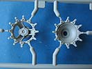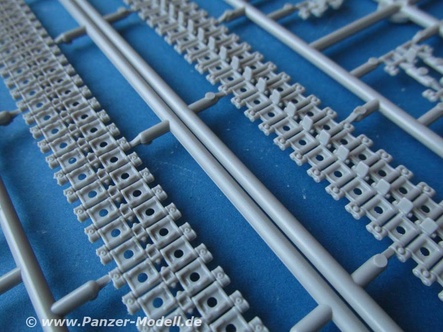 Die Schwingarme werden einzeln in die Wanne eingesteckt und verklebt - es ist keine Funktion vorgesehen. Das ist aber auch nicht schlimm, denn die Ketten im Bausatz sind aus starren Kettensträngen und Einzelgliedern. Der Guss der Kettenteile ist exzellent mit feinen Details und die Machart mit durchbrochenen Gliedern ist wunderschön anzusehen.