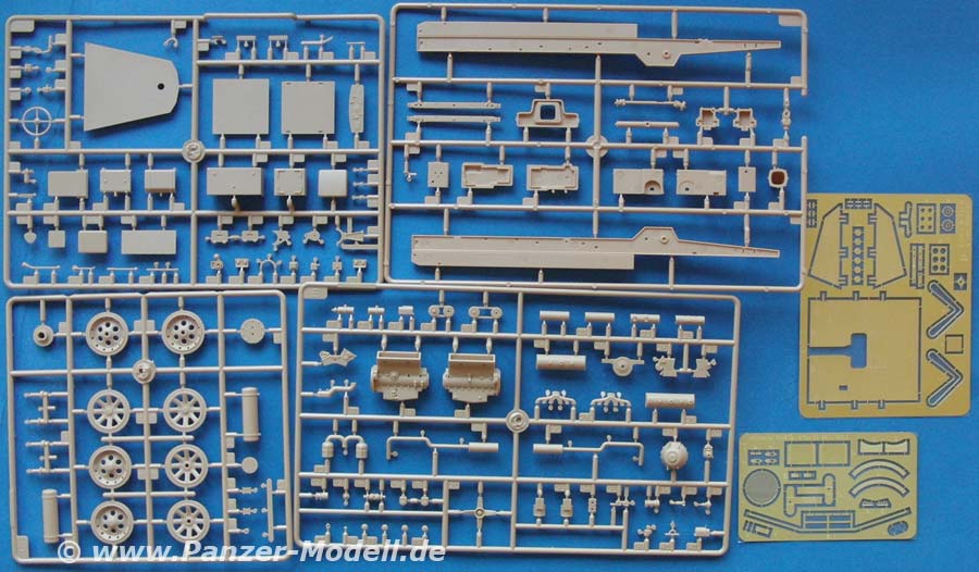 Was mit am erfreulichsten ist, ist dass Trumpeter nach dem gepanzerten Sd.Kfz.8, das auf dem DB10 Fahrgestell mit Schwingarmen basierte, für dieses Modell das korrekte DB9 Fahrgestell mit den Blattfedern beigelegt hat.