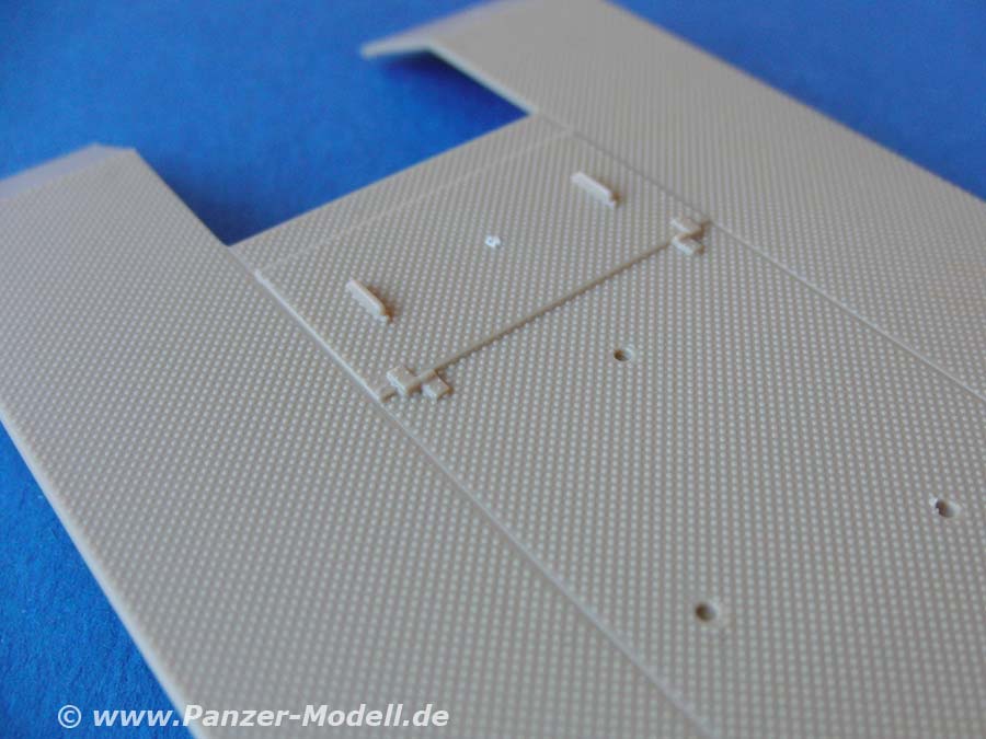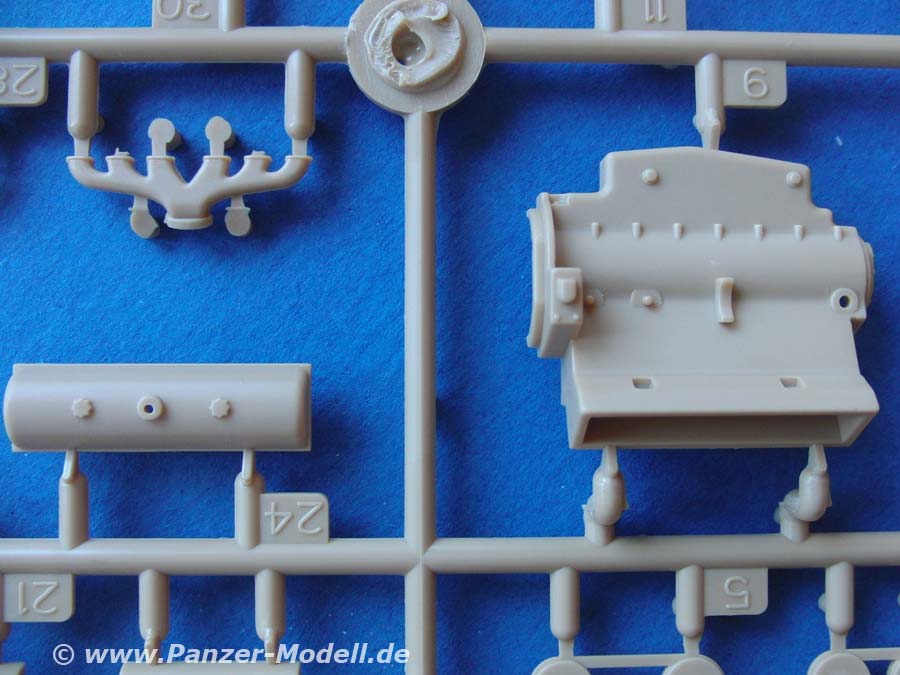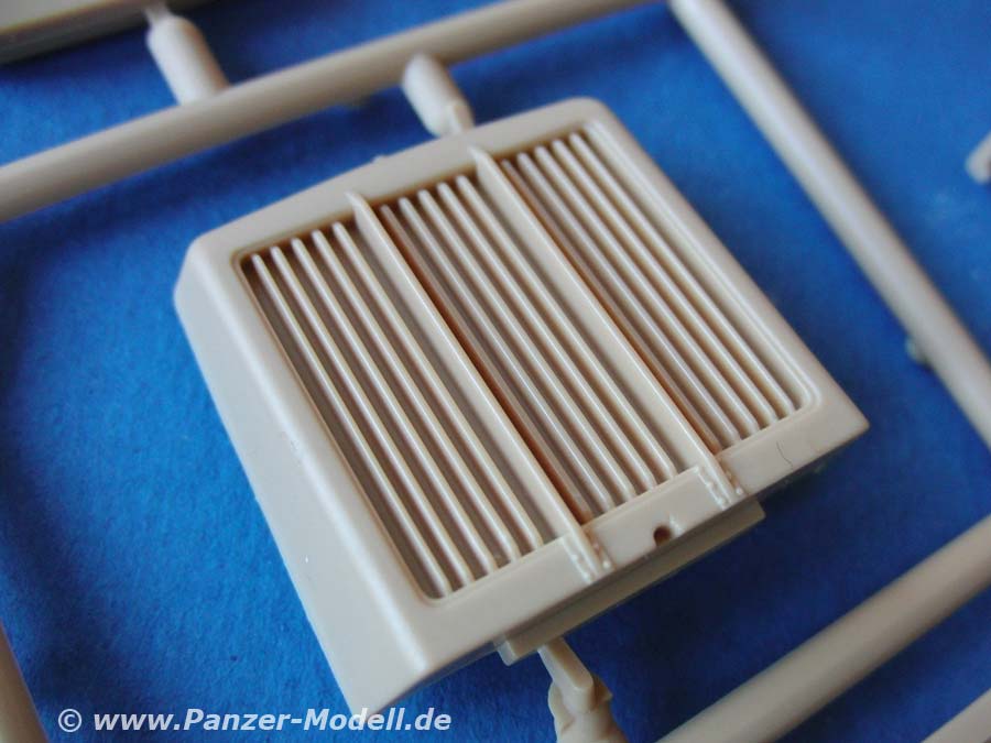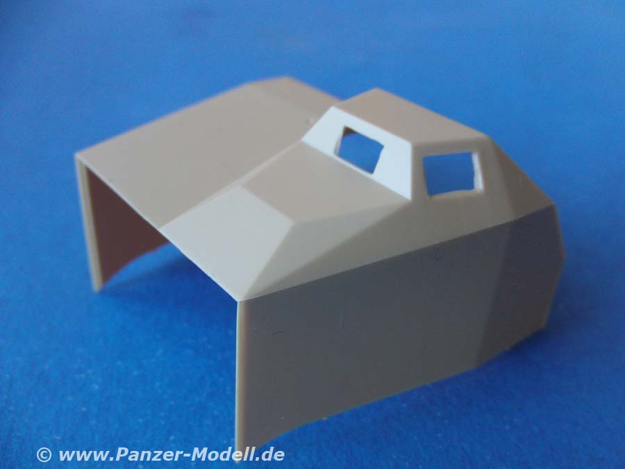 Der gepanzerte Aufbau für den Fahrer ist in einem Stück gemacht und spart somit eine Menge Sorgen beim zusammenbau. Der überpanzerte Motorraum macht ebenfalls einen guten Eindruck. Zwar sind die seitlichen Luken einzeln einklebbar und damit theoretisch offen darstellbar, aber es fehlt an den Innendetails der Luken.