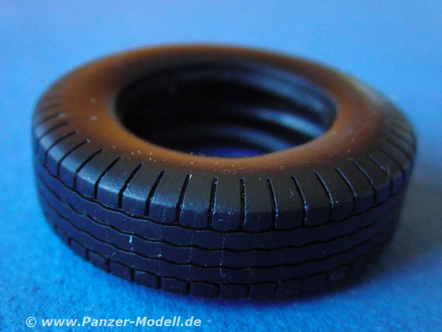 Der Fahrwerksrahmen besteht aus den zwei Längsholmen mit massenhaft Anbauteilen, wie Getriebe, Drucklufttanks, Winde, usw. Die Treibräder wie auch Laufrollen sind ebenfalls sehr fein und sauber gemacht. Die Frontreifen sind aus elastischem Vinyl denen die Felge aus Spritzguss eingesetzt wird. Diese Vinylreifen machen einen sehr guten Eindruck. Diesen fehlt zwar der Seitenaufdruck, dafür ist das Profil sehr fein und wirklich gut gemacht.