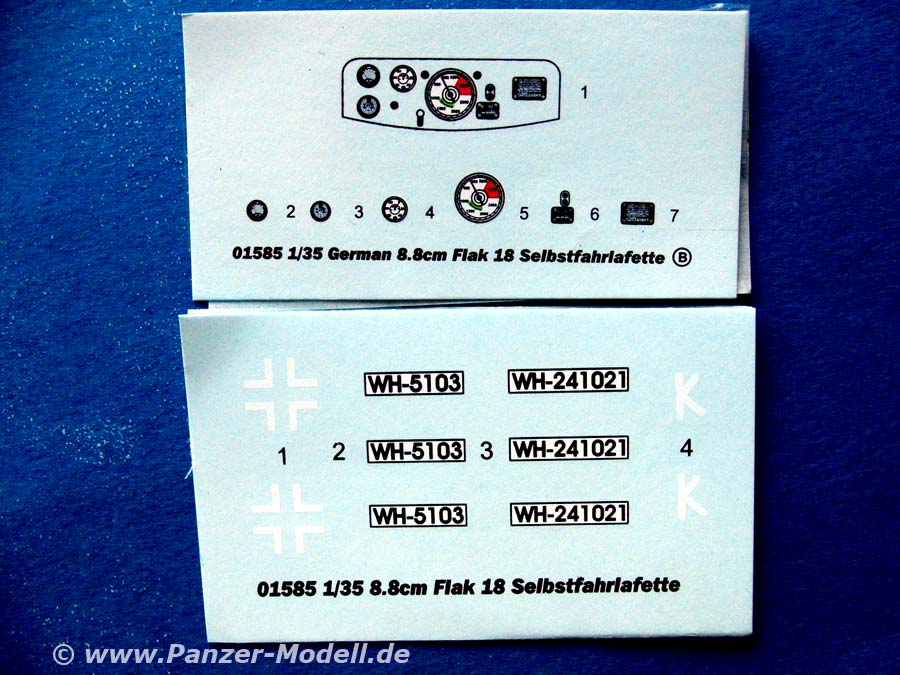 Für die Bemalung liegt ein einseitig farbig gedrucktes DIN A4 Blatt bei, das das Fahrzeug in grau zeigt und die Markierung mit Balkenkreuz, 2 verschiedene Nummernschilder und die Markierung "K".