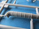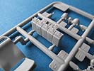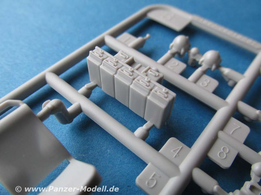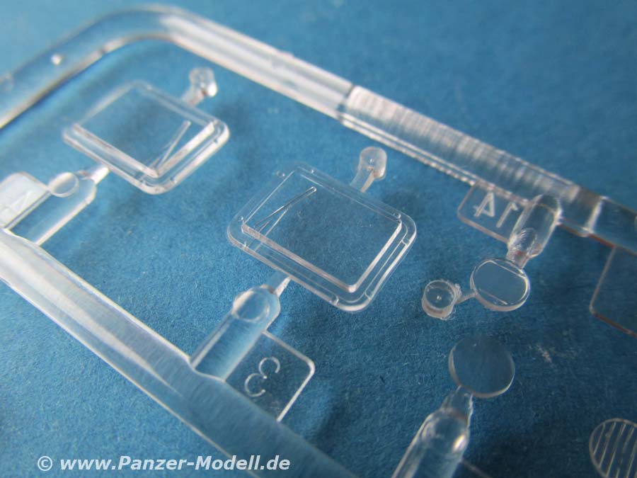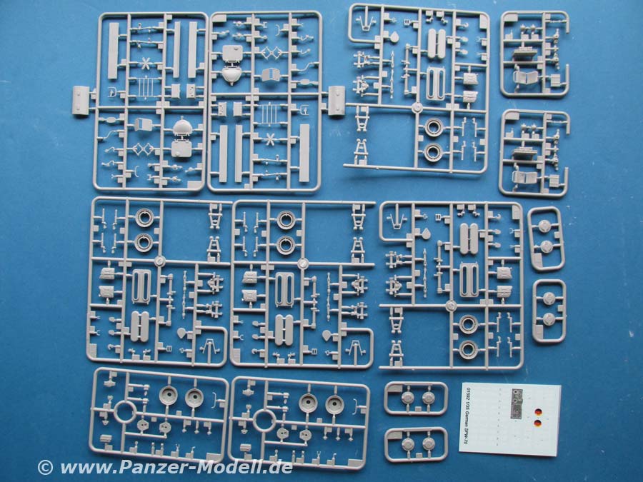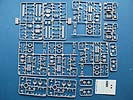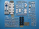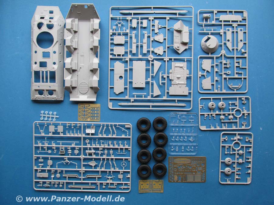 Der Bausatz enthält 19 mehr und weniger große Spritzlinge aus hellgrauem Plastik, einen Spritzling Klarsichteile, Ober- und Unterwanne, drei Platinen mit PE-Teilen, 8 Vinylreifen, Polycaps und ein Decalbogen.