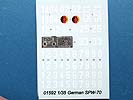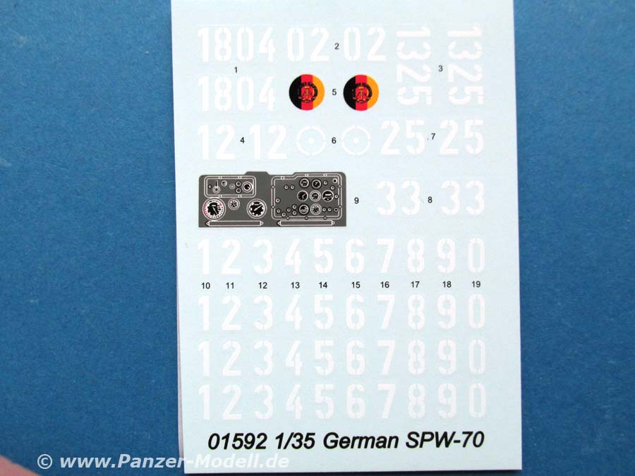 Für die Bemalung und Markierung liegt ein doppelseitig farbig gedruckter DIN A4 Bogen bei, der zwei verschiedene Markierungen mit unterschiedlichen Nummern je eines Fahrzeugs bei der NVA in dunkelgrün zeigt. .