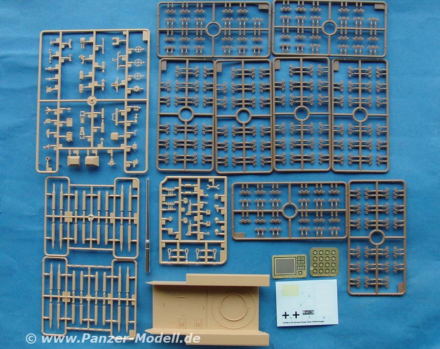 Im Karton finden sich über 420 Teile an 16 Spritzlingen, ein Metallrohr, Ober- und Unterwanne, PE Teile und ein Decalbogen.