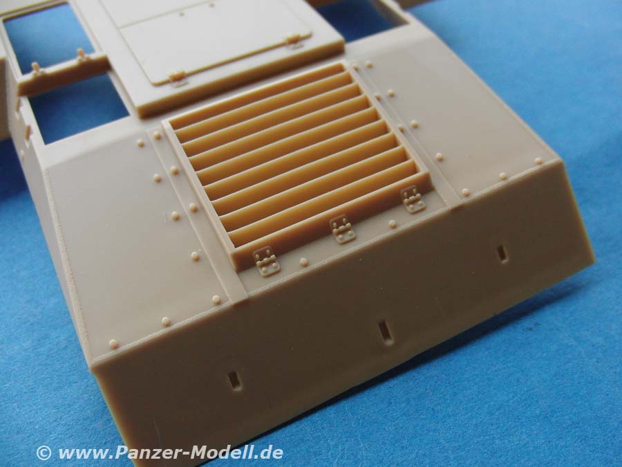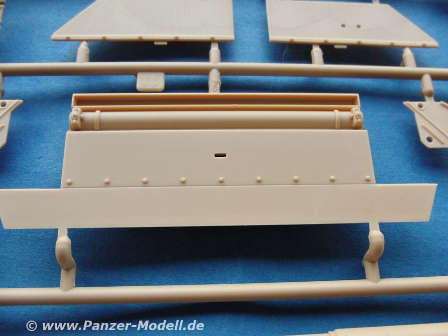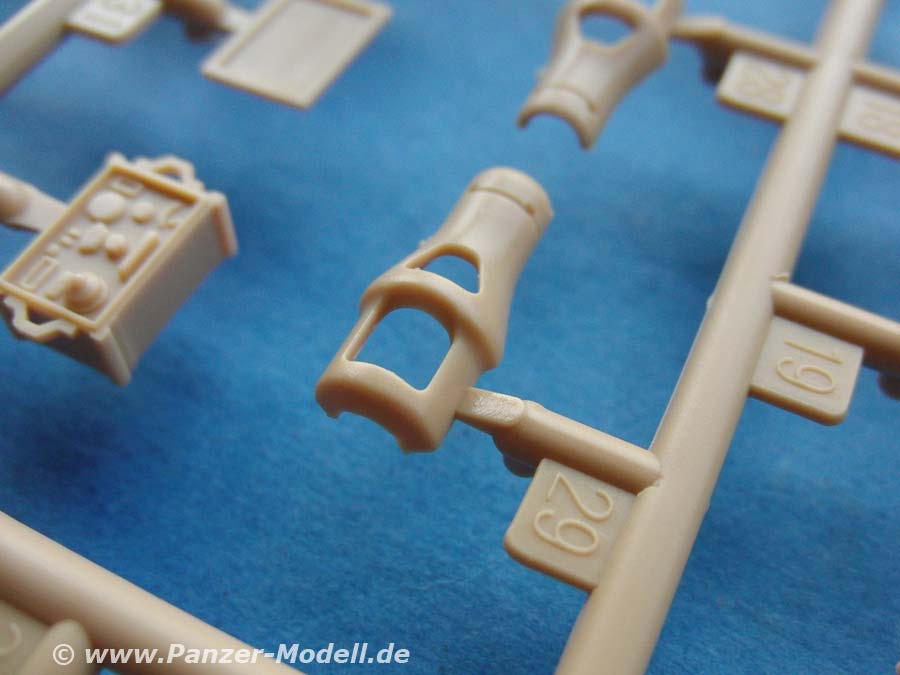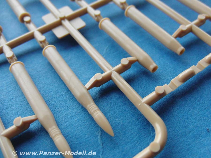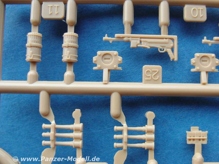 Turm und Kanone sind sehr gut dargstellt, zumal der Turm oben offen ist und den Blick auf das Innenleben freigibt. Die Kanone ist als Metallrohr ausgeführt und sieht hervorragend aus. Wer will kann das Rohr aber auch aus zwei Plastik Halbteilen zuammenkleben.