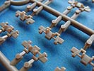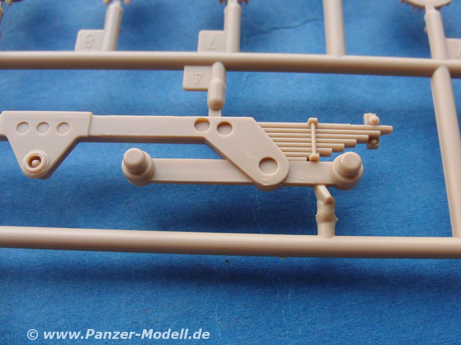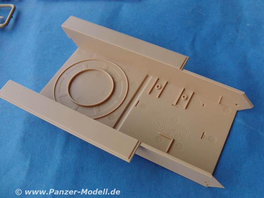Unter-, Oberwanne und Turm sind als recht große Teile gespritzt und machen einen hervorragenden Eindruck. Das Laufwerk ist recht einzigartig mit seinen Federlementen, die hier als ein Stück pro Seite an die Wanne geklebt werden können. Die Laufrollen sind sehr markant in ihrem Aussehen mit den großen Bolzen - dies ist hier sehr schön wiedergegeben.