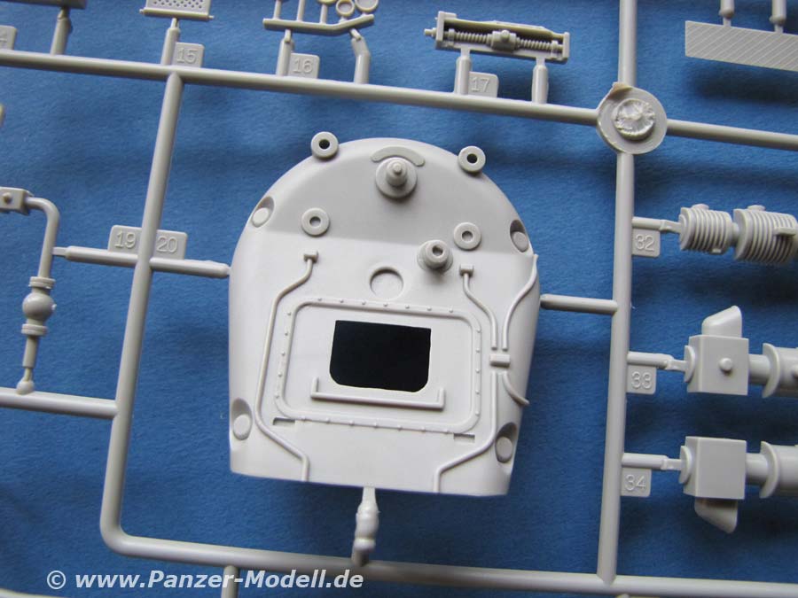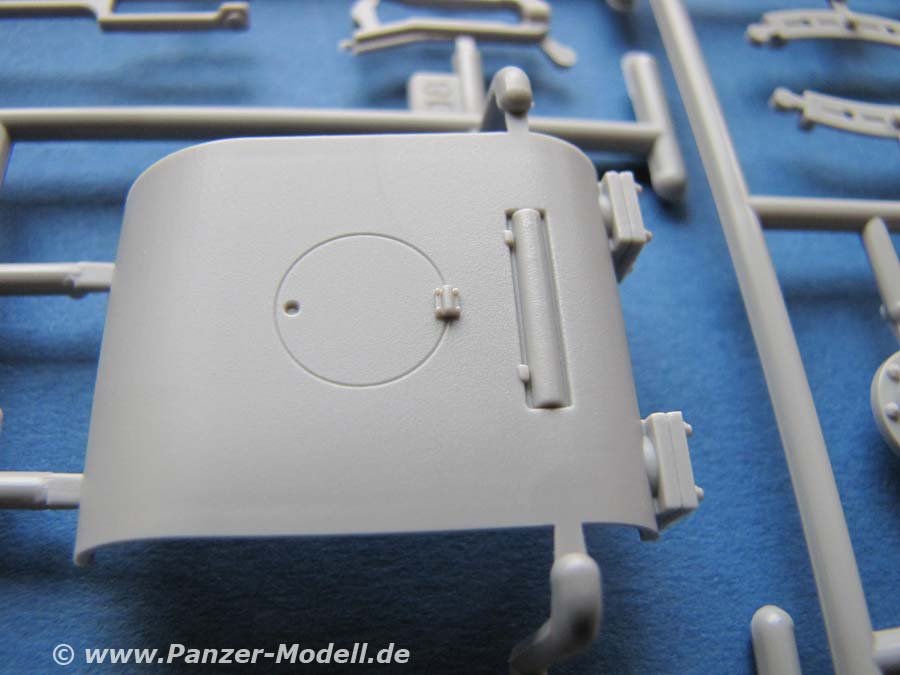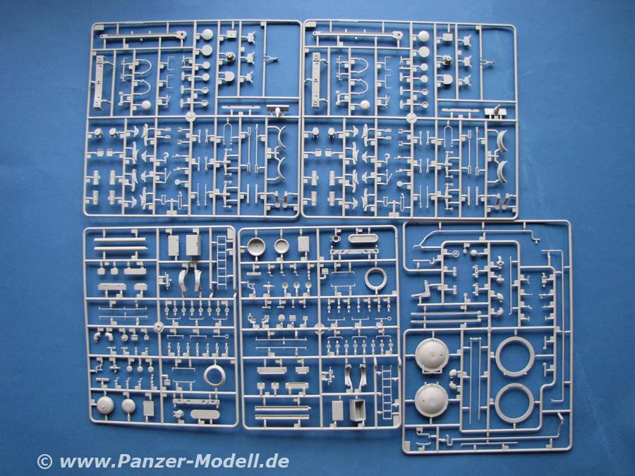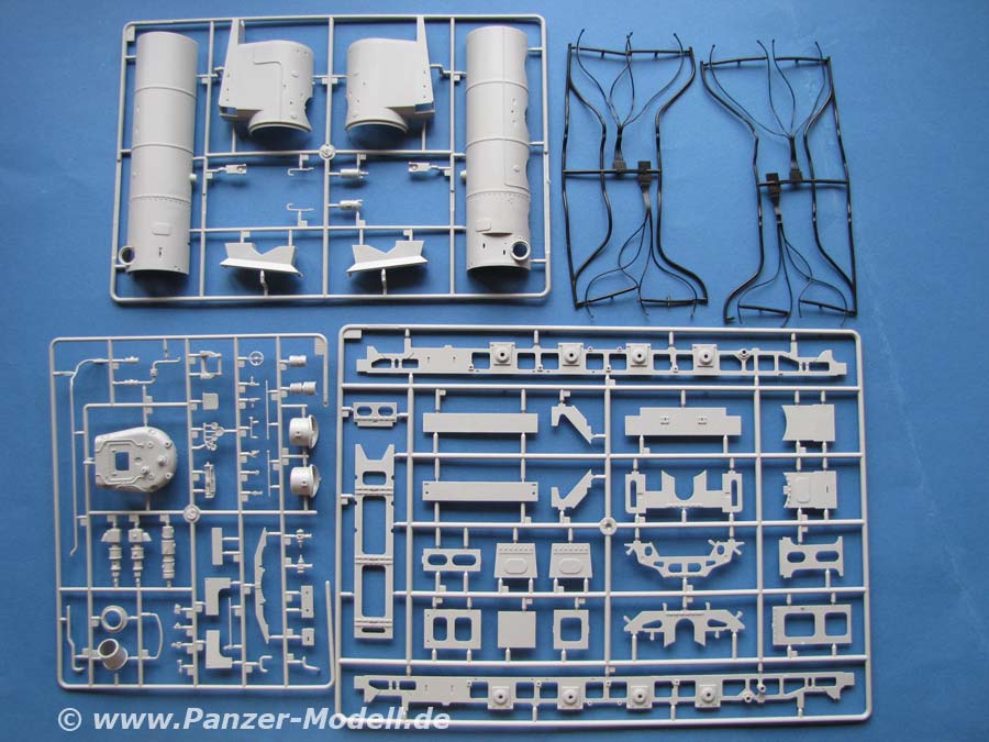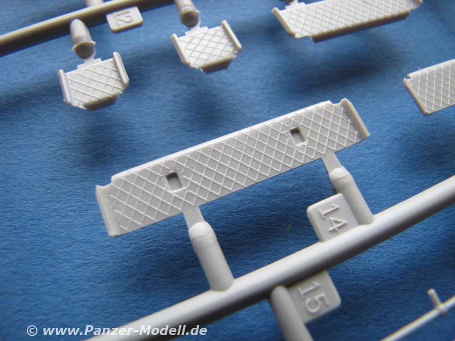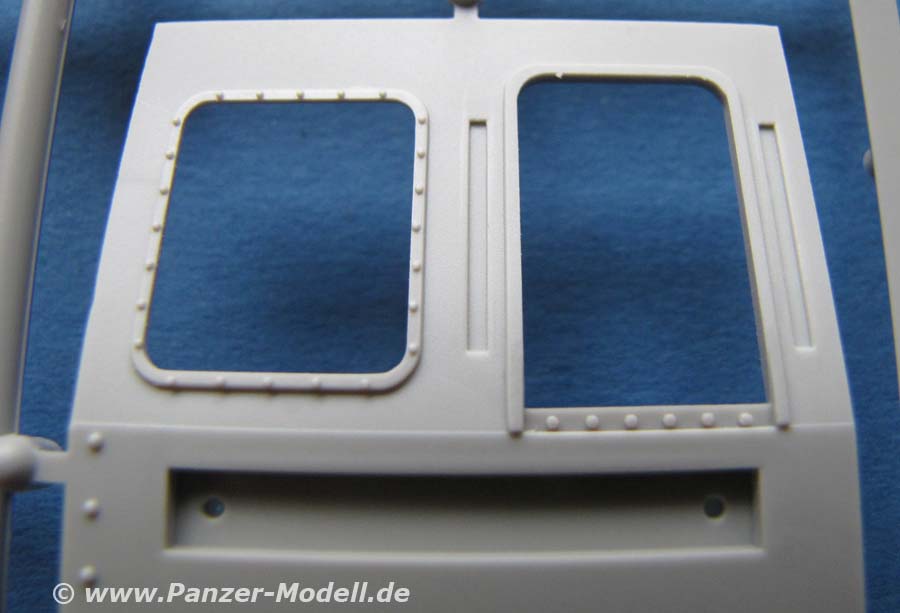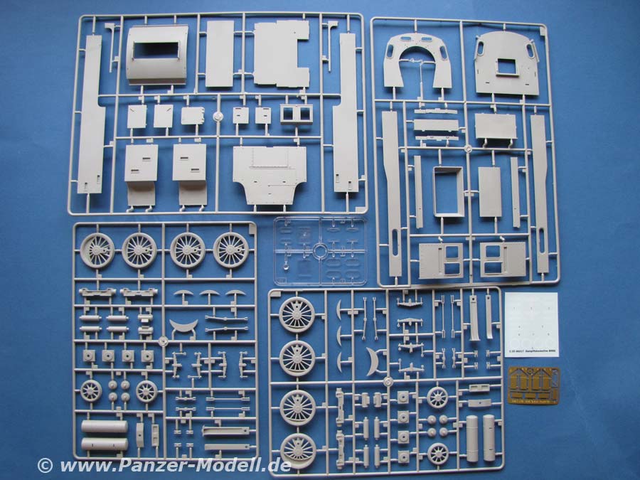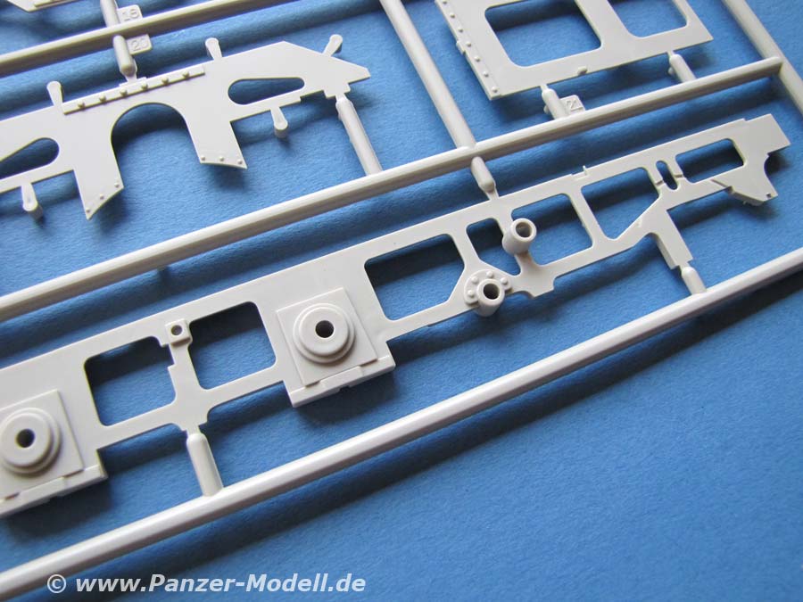 Die Spritzgussteile machen allesamt einn sehr guten Eindruck. Details sind reichlich vorhanden und sauber dargestellt. Dafür findet man reichlich Auswerfermarken, allerdings immer auf den Innenseiten der Teile, sodass es ausser beim Führerhaus kein bisschen stört.
