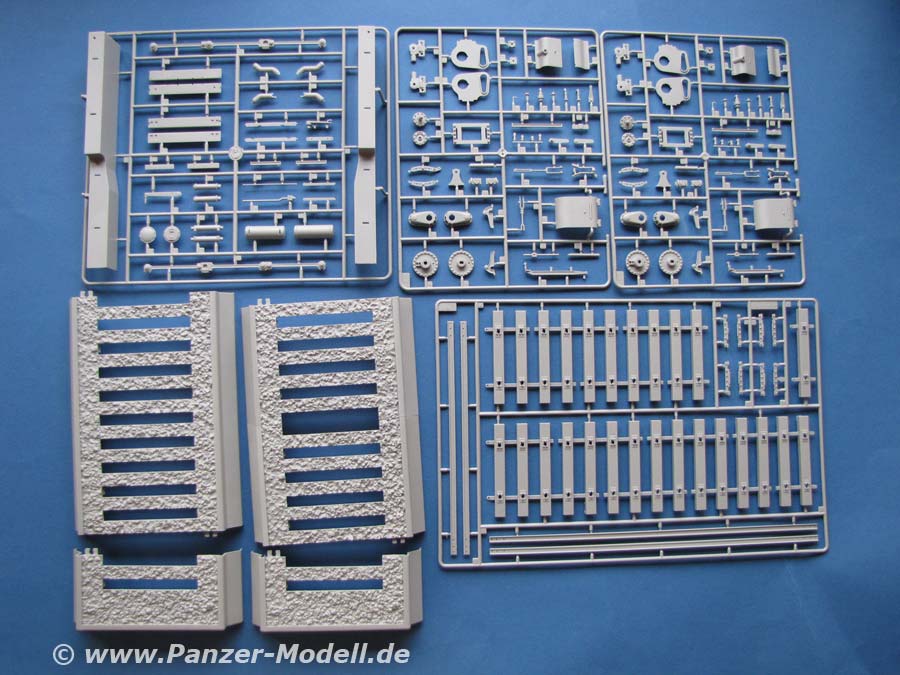 Der Bausatz enthält über 600 Bauteile an 16 Spritzlingen plus ein Spritzling durchsichtige Plastikteile, Sandleitungen aus Vinyl, Schotterbettunterbau, PE Teile, und natürlich ein Decalbogen.