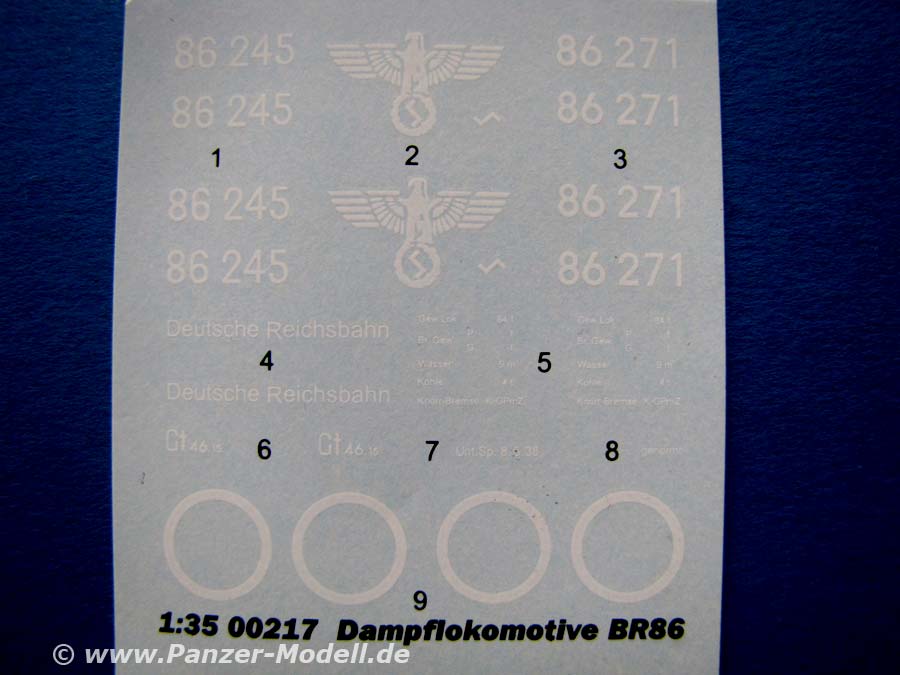 Schö, das für beide entsprechende Decals beiliegen und dass man insofern dazugelernt hat, als dass man das bei der BR52 fehlendeund bemängelte Kreuz zu Füßen des Reichsadlers diesmal zweigeteilt dargestellt hat, sodass der geneigte Modellbaer in der Lage ist eine historisch korrekte Abbildung für seine Vitrine zu schaffen.