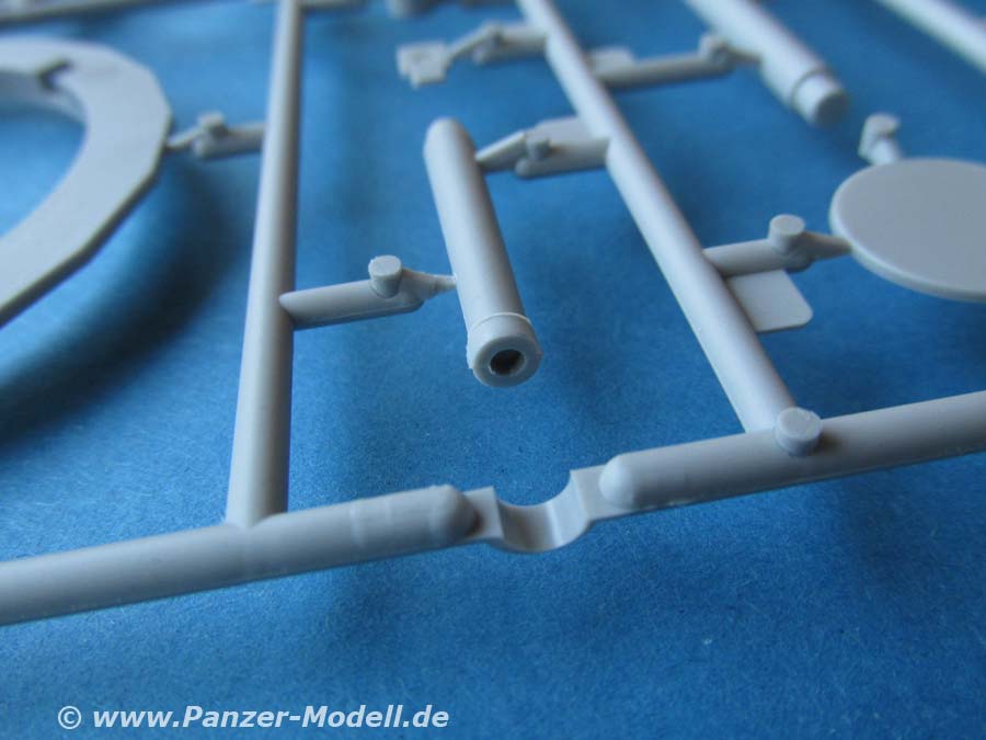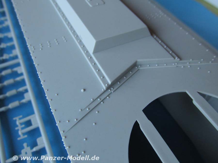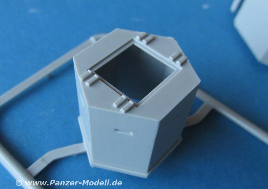 Auch die beiden vieleckigen Geschütztürme machen einen exzellenten Euindruck mit sauberen und verzugsfreien Flächen und Nietendetails. Die Geschützrohre sind aus Plastik und im hinteren Teil zweiteilig, im vorderen Bereich einteilig ausgeführt. diese bleiben in der Höhe beweglich. Die Zugangsluken können offen oder geschlossen gebaut werden, da aber im Inneren keine Details oder Einrichtung vorhanden sind, macht eine offene Darstellung nur Sinn, wenn man sie mit einer Figur füllt.