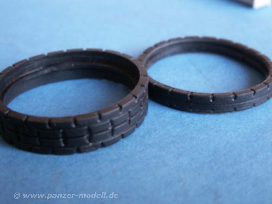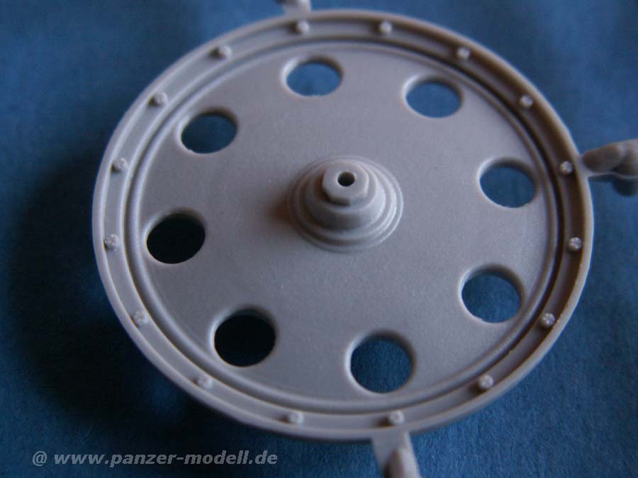 Die Räder sind ganz gut geraten und haben nette Details. Die Gummibandagen zeigen das frühe Profilmuster, was einen guten Eindruck macht. Allerdings kranken diese Vinylbandagen am bekannten Problem von Vinyldingen - sie reissen irgendwann, wenn der Weichmacher verdampft ist. Hier hat Dragon mit den Vollkunststoffräder die bessere Variante gewählt.