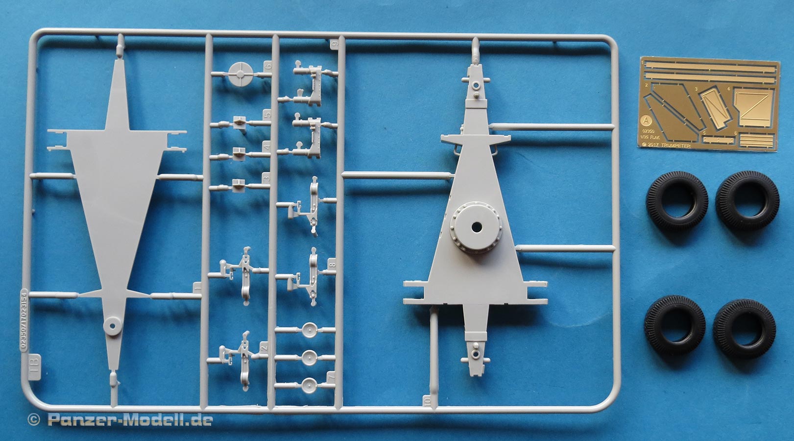 Der Bausatz beinhaltet sowohl die Flak an sich wie auch den entsprechenden Transportanhänger. Die beiden Achsaufnahmen sind recht schön gestaltet mit nicht allzuvielen Kleinteilen - hier und da ezegn sich ein paar Unterschiede zum einem überlebenden Museumsanhänger, aber in meinen Augen nichts gravierendes. Wer akribisch genug ist und Recherche betreiben will, hat zumindest eine gute Basis für Nachdetaillierungen.