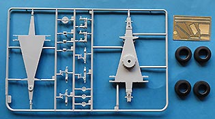 Im Bausatzkarton finden wir übersichtliche 5 graue Spritzlinge, 4 Vinylreifen und ein PE Bogen.