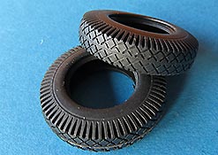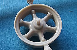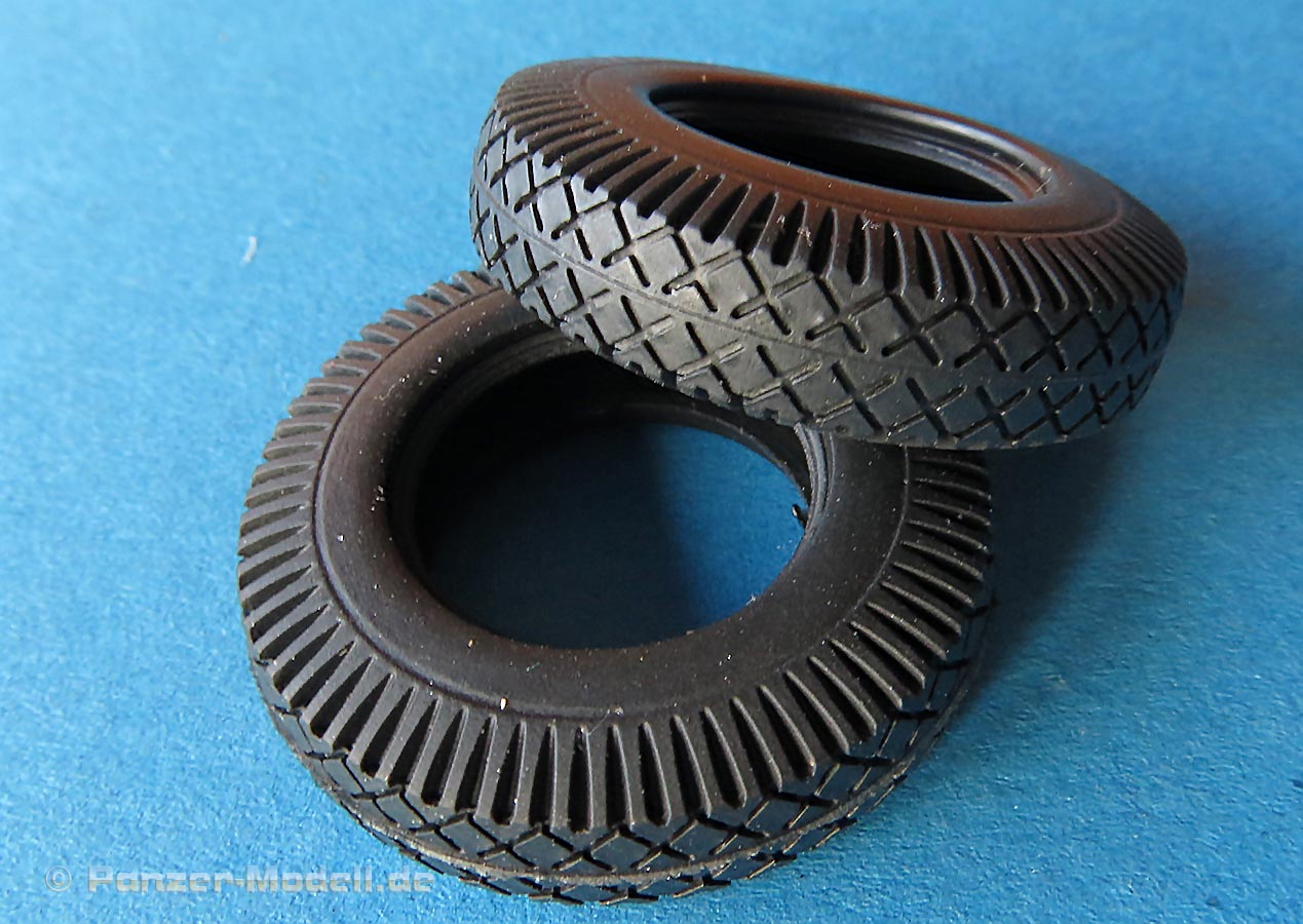 Die Speichenfelgen machen einen guten Eindruck und sind mit ihren geschwungenen Speichen schön dargestellt. Die Felge an sich baut sich aus drei Teilen zusammen auf der dann der Vinylreifen aufgezogen wird. Die Vinylreifen sind wirklich gut gelungen - feine, scharfe Details und sauberes Profil der Lauffläche. Allerdings fehlen Herstelleraufdrucke auf den Reifenflanken.