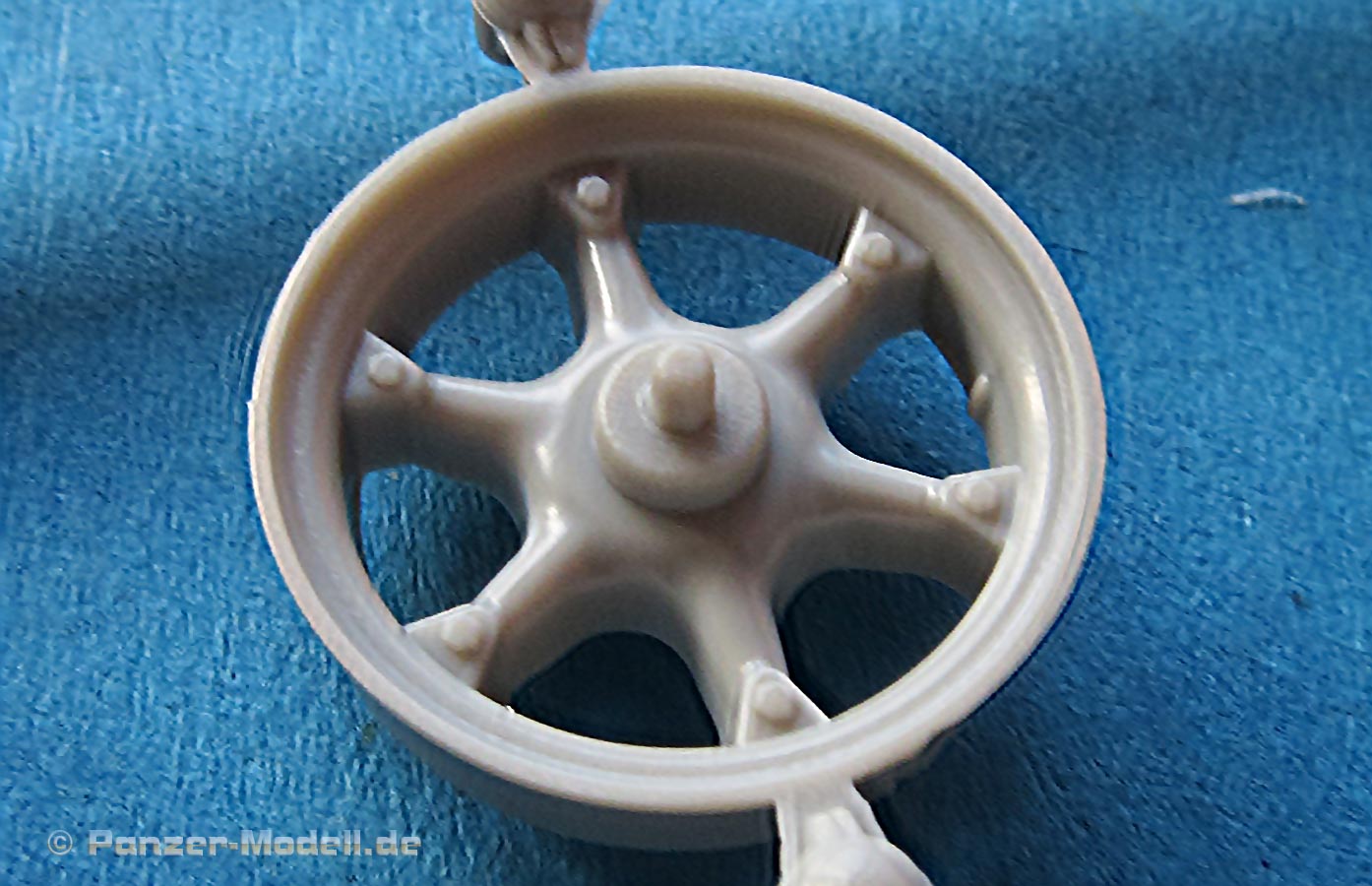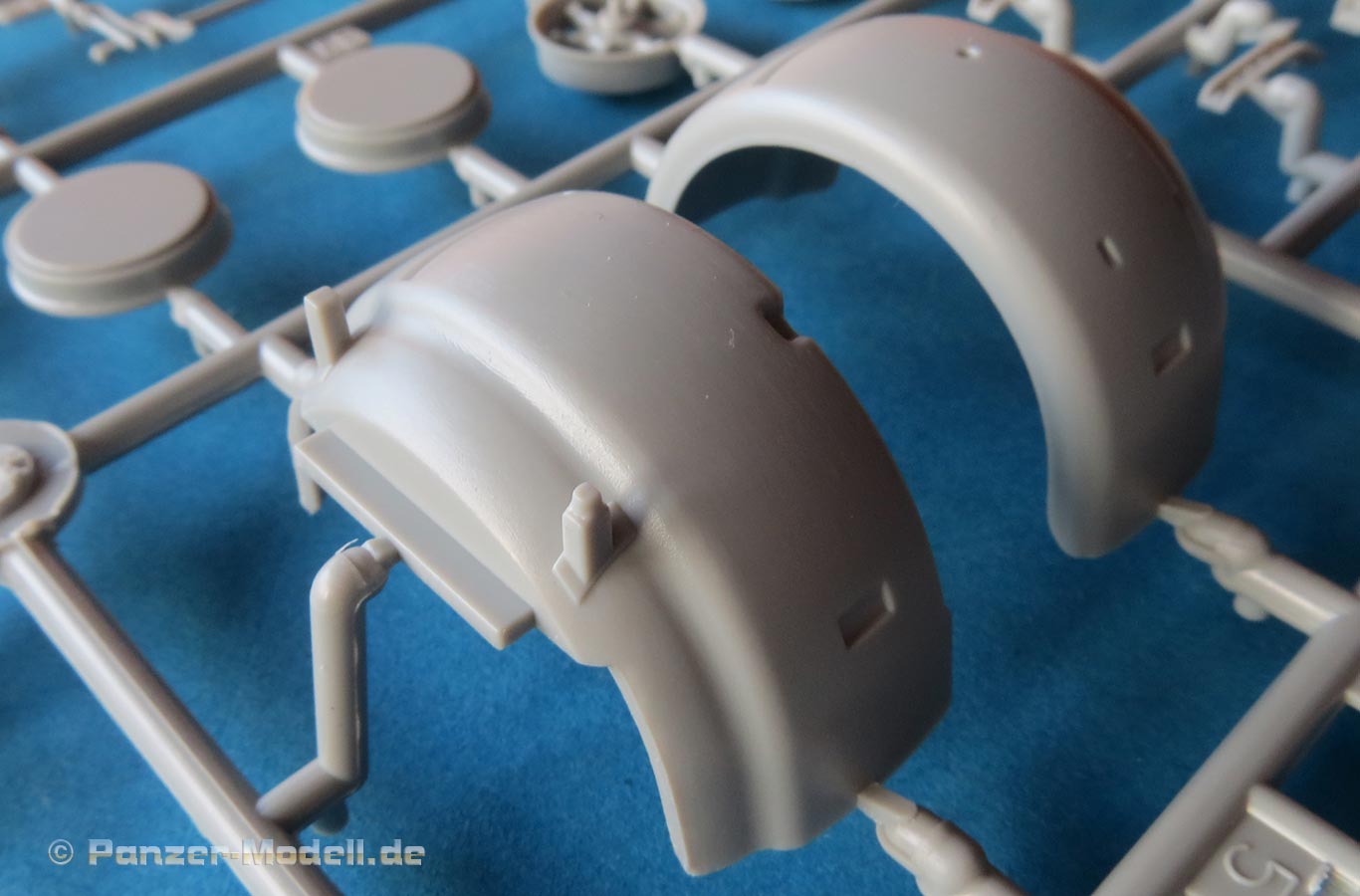 Die Radabdeckungen sind mit ihrer Rundung schön geformt und mit je zwei Winkelblechen an der entsprechenden Achsaufnahme befestigt. Schanzwerkzeug und Kästen sind entsprechend beigelegt und werden auf den Abdeckungen befestigt.