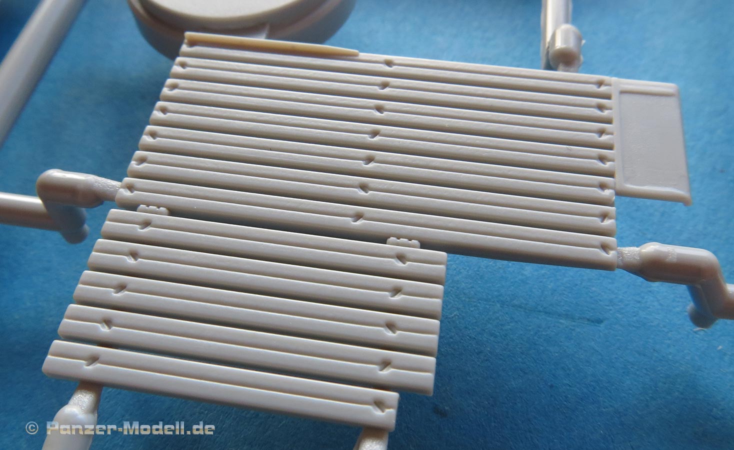 Wie bei Trumpeter mittlerweile gewohnt ist die Qualität der Bauteile recht gut. Kein Verzug, keine Fischhäute, kaum störende Auswerfermarken und allgemein gut gestaltete Details.