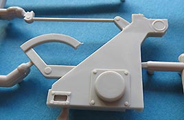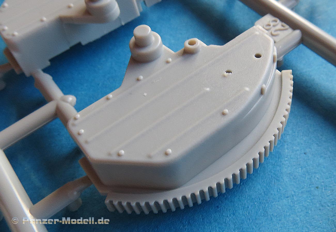 Das Flakschild ist im Prinzip einteilig mit schönen aufgeprägten Nieten und Scharnieren. Von innen wird eine zweite Platte mit Details und Vestrebungen angebracht. An sich schön gemacht, wennauch maßstäblich etwas stark. Leider ist das Design des Schilds nicht zuende durchdacht, denn Trumpeter hat die Sichtluke der Richtoptik geschlossen mit an das Schild angespritzt - eine Darstellung in Feuerstellung ist so nur möglich wenn der Modellbauer die Luke selber vorsichtig heraustrennt.