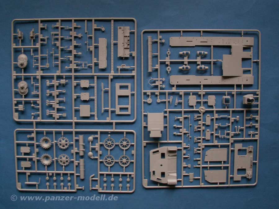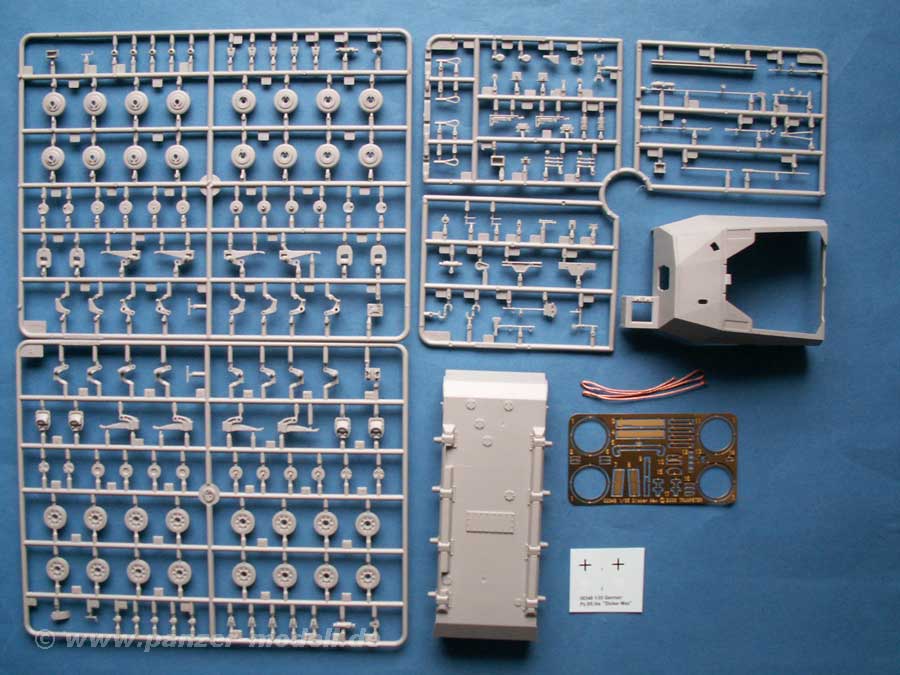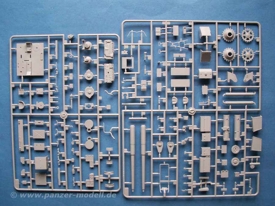 Im Bausatz finden sich 18 Spritzlinge mit 631 Teilen, von denen die meisten auf die wundervoll gestaltete Einzelgliedkette entfallen. Dazu die Wanne, der Hauptaufbau, Vinylketten, eine Platine PE Teile, Kupferkabel und einen kleinen Decalbogen
