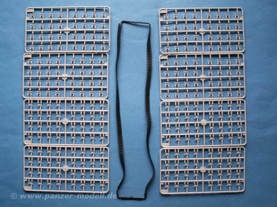 Die Kette kann wahlweise als Vinylkette oder als Plastikspritzguss-Einzelgliedkette gebaut werden. Erstere hat den Vorteil, dass die schnell aufgezogen und gut detailiert ist, dafür aber schwierig mit Kettendurchhang darzustellen ist. Die Einzelglieder sehen ebenfalls exzellent aus, hat aber drei Befestigungspunkte, was die Versäuberung erschwert.