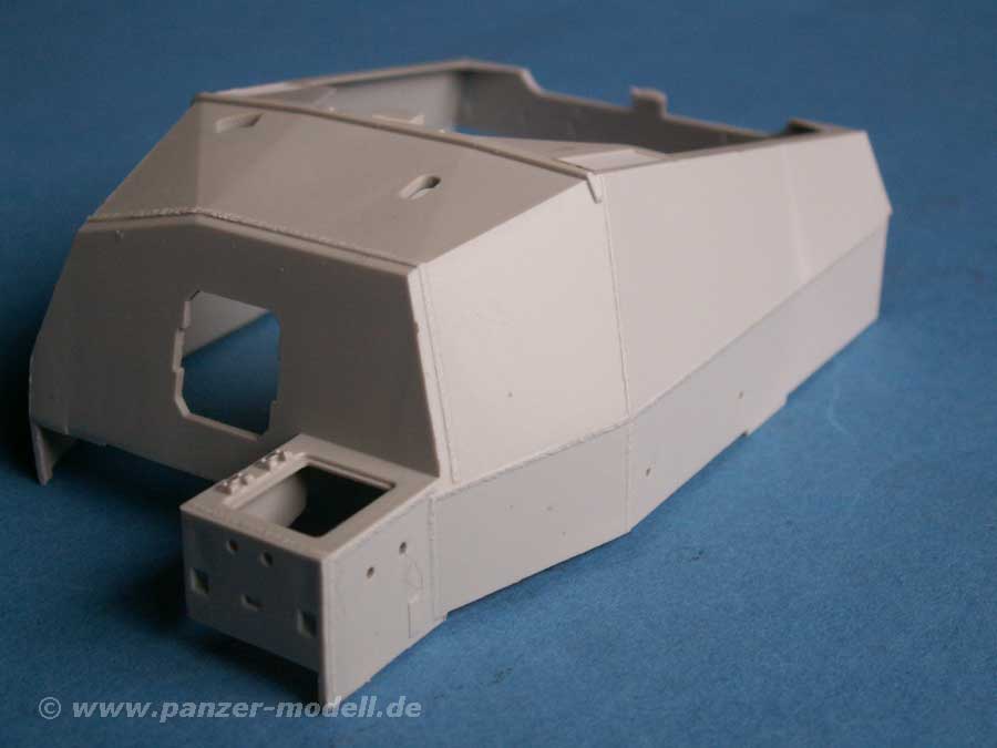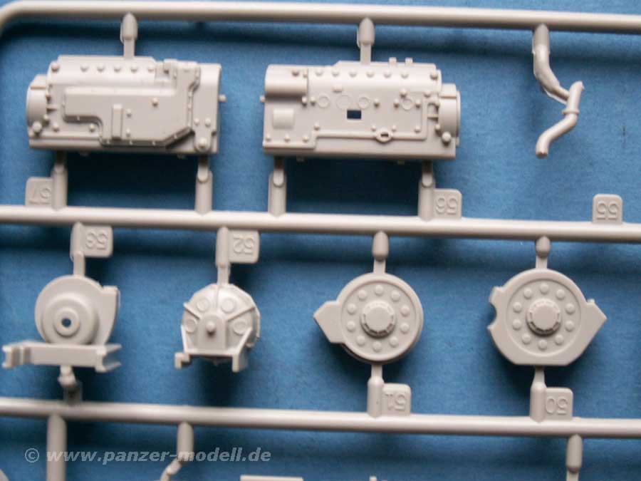 Die Unterwanne ist eine Standard Panzer IV Wanne mit neuer Heckwand und neuen Treibrädern. Das Laufwerk kennt man nun schon vom Munitionspanzer IV, welches beweglcih gebaut werden kann, dafür allerdings keine Herstellerbezeichnung auf den Rollengummis und wesentlich zu kleine Bolzen an der Befestigung an der Wanne aufweist. Die Wanne weist unterhalb die falschen Details auf, aber unter gewöhnlichen Umständen wird das niemand am fertigen Modell sehen.
