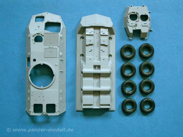 Dei Qualität ist nach einem ersten Blick als wirklich gelunegn zu bezeichnen. Die Wanne ist als Ober und Unterwanne schon relativ komplett aber gut detailiert wiedergegeben, für die Räder liegen Plastikfelgen und Gummireifen mit schön gestaltetem Profil und feinen Seitenwanddetails bei - Gussgrate sucht man hier vergeblich!