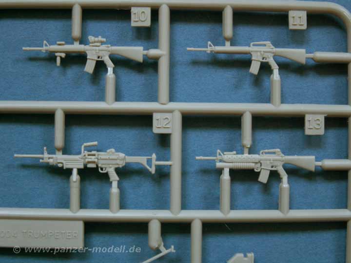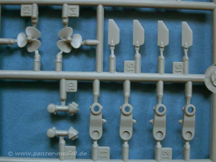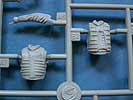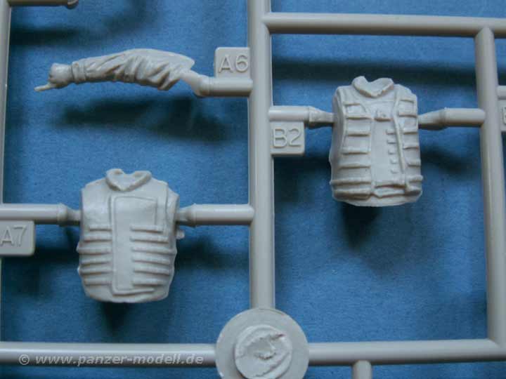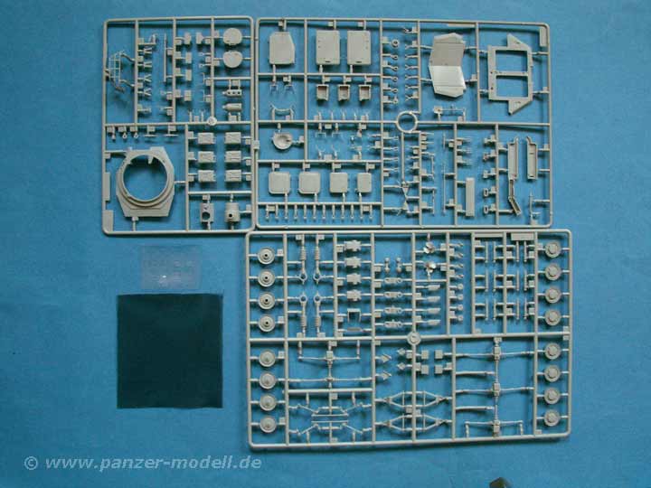 Einen Großteil der Teile macht das Fahrwerk aus, das fein und detailiert gestaltet ist. Auch die übrigen Anbauteile des Fahrzeugs machen einen sehr gute Eindruck. Dazu gibt es noch Gittermaterial für die Staukörbe und dünnes Klarsichtmaterial für die Periskope - es wurde also an alles wichtige gedacht. Ergänzend liegt dem Bausatz ein vierköpfiges Set an Figuren bei, die als bewaffnete Infanerie neben dem Fahrzeug agieren kann - leider keine Crew für das Fahrzeug an sich. Aber auch die Figuren sind gut gelungen und haben einen ganzen Schwung Zubehör dabei, wie persönliche Ausrüstung und verschiedene Feuerwaffen.
