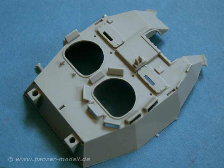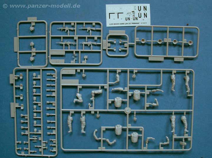 Besonders schön ist das Extrablatt, das im Farbdruck die Markierung und Bemalung des Fahrzeugs zeigt, denn mit den Decals lassen sich entweder eine Version als UN Fahrzeug oder eine nicht näher bestimmte Version im Dreifarbtarnanstrich darstellen - zusätzlich sind noch zwei SFOR Schriftzüge enthalten, die an nach belieben verwenden kann.