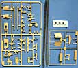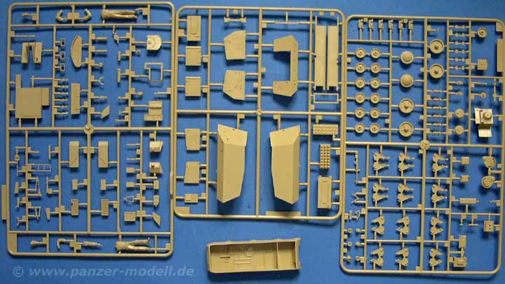 Dieser Bausatz umfasst ganze 5 Spritzlinge, sowie die Wanne und 2 Vinylketten. Ketten und Wanne sind wie bereits beim Bausatz 351 besprochen sehr schön, die Wanne weist Innendetailierung und Ausstattung auf.