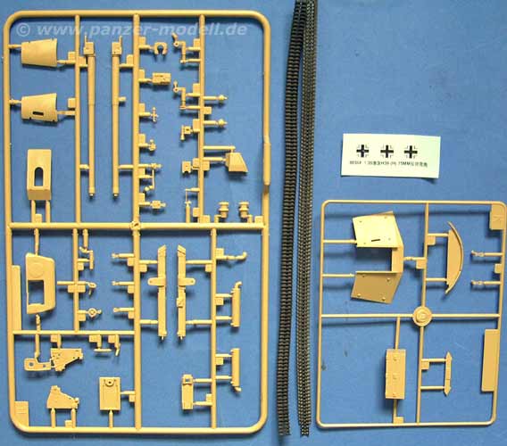 Das Laufwerk sieht sehr gut aus, gut detailiert (jedes Laufrollenpaar besteht aus etwa 8 Teilen inklusive Federung). Die Oberwanne ist wie beim Bausatz 353 als große Panzerplatten als Aufbau ausgebildet. Diese Teile machen eine guten Eindruck, wenn vielleicht maßstäblich etwas zu dick. Der Innenraum ist angefangen beim Fahrerplatz bis zur Detailierung des Kampfraumes ganz gut, kann aber durchaus noch weiter verfeinert werden. Die 7,5cm PaK40/3 besteht aus recht vielen Teilen und macht einen guten Eindruck. Der Innenraum hat einen gut gestalteten Funkgerätesatz, sowie weitere Ausrüstungsteile und die Munitionsverstauung. Zwei Figuren für den Innenraum, die relativ nett sind, runden den positiven Eindruck ab!.