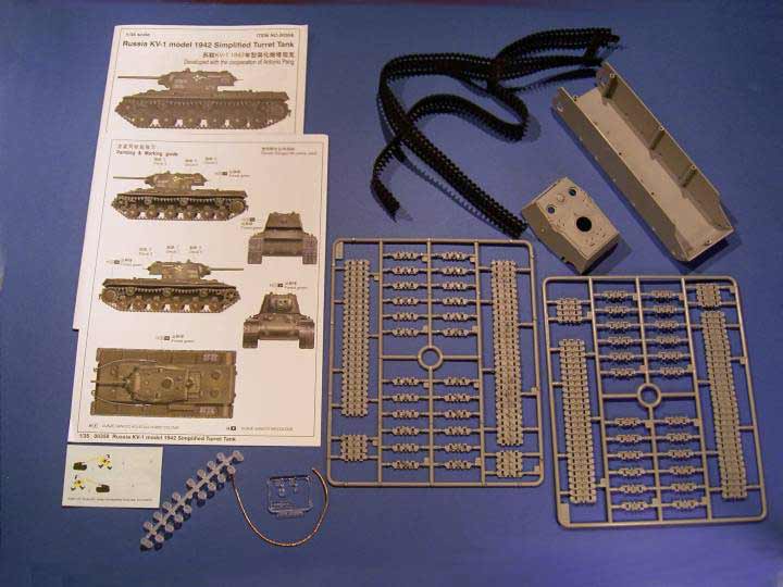 Trumpeter baut seinen Fahrzeugpark aus und beglückt den Modellbauer mit einer weiteren Variante des KV-1, dem KV-1 model 1942 simplified turret mit der Nummer 358. Neben einem Stück Kupfer-Seil für die Abschleppseile, deren Kauschen über Löcher verfügen, welche dem Bastler ein Verstecken/Verspachteln der sonst meist offenen Kauschenseite erspart. Auch das Kanonenrohr besteht aus einem Stück und besitzt eine offene Mündung. Es stehen dem Modellbauer zwei Ketten zur Auswahl (Gummi/Vinyl und Polystyrol), wobei bei der Kette aus Segmenten und Einzelgliedern recht schnell zu Entfernende erhabene Auswerfermarken auf der Innenseite vorhanden sind.