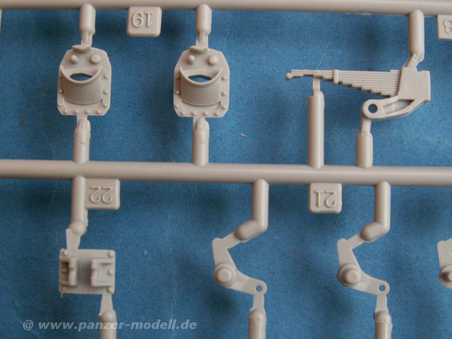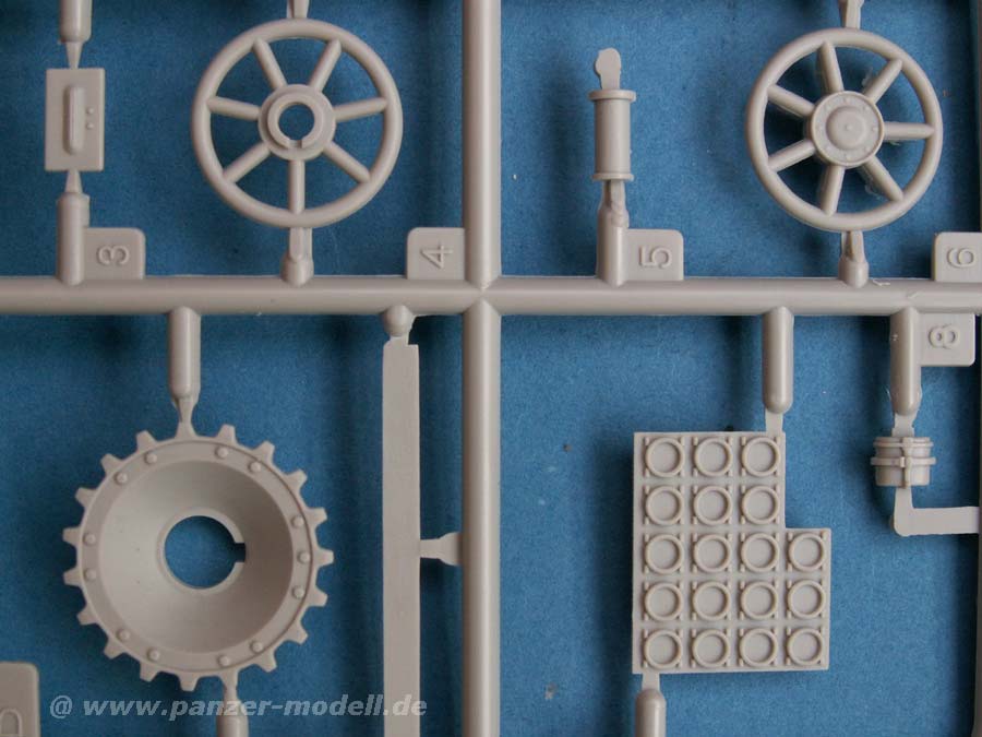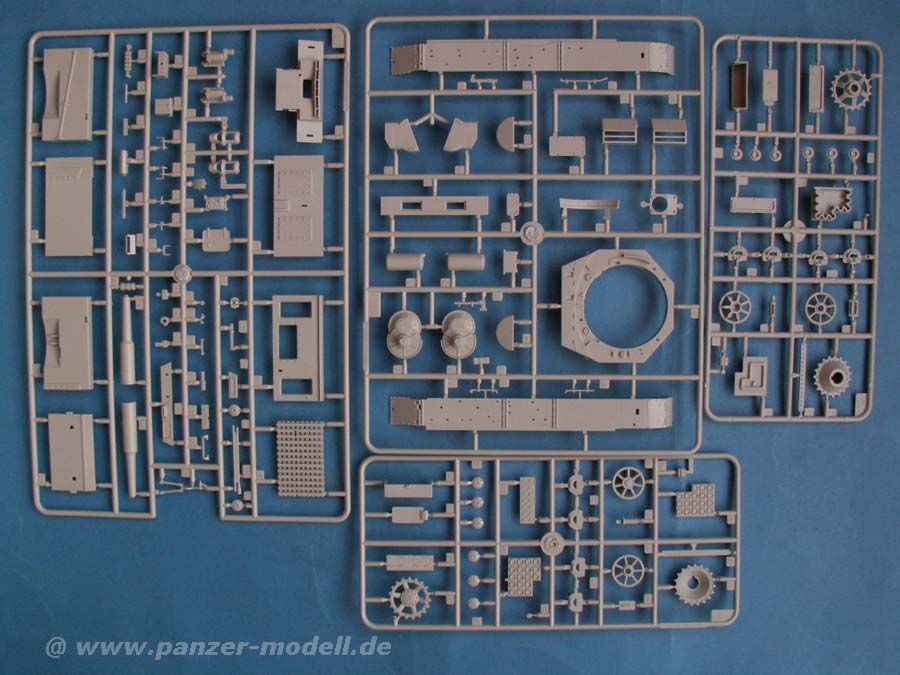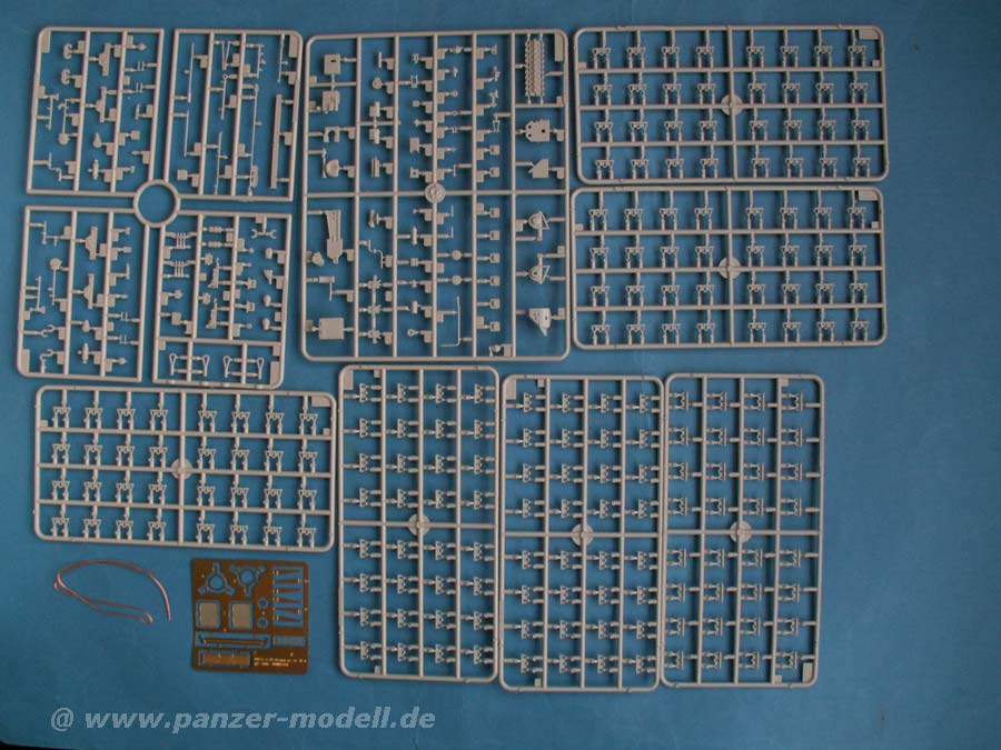Im Karton finden sich 590 Teile an 14 Spritzlingen, der Unter- und Oberwanne, dem Turmoberstück, eine Platine mit PE Teilen, kupferdraht und einen Decalbogen.