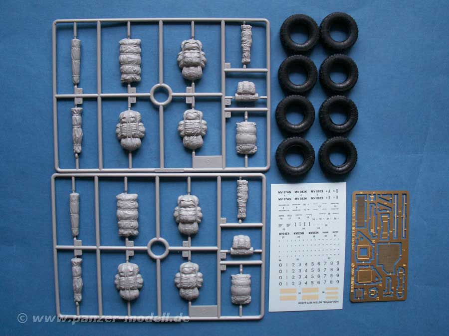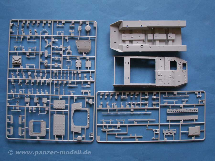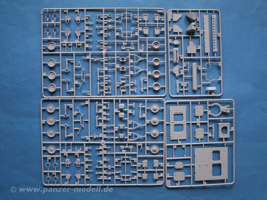 Im Karton finden sich 307 Teile an 8 Spritzlingen, der Wanne, Gummireifen, eine Platine mit PE Teilen und einen Decalbogen.