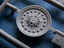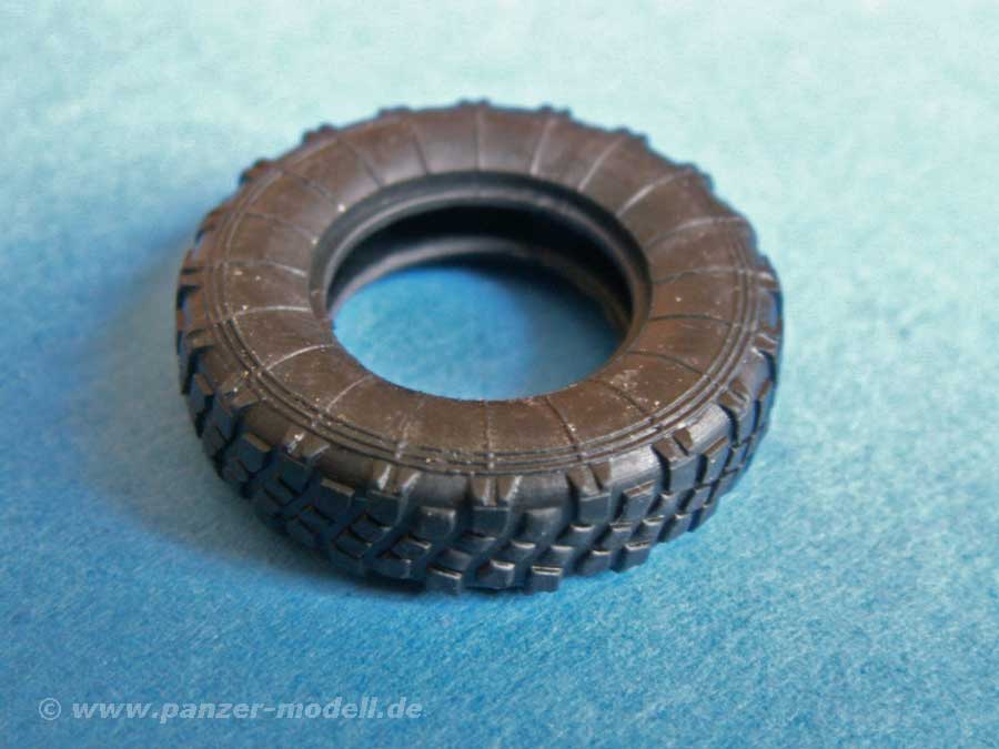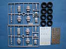 Das Fahrwerk besteht aus den vier Achsen mit Anbauteilen, die erstaunlich übersichtlich sind und die Arbeit vereinfachen. Die Räder, bzw. die Felgen sehen schön aus, auch wenn die äußeren Bolzen etwas zu groß erscheinen. Darauf werden die Gummireifen aufgesteckt, die schön gemacht sind - das profil wirkt exzellent, nur leider gibt es keine Herstelleraufschrift auf den Seiten.