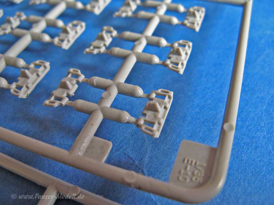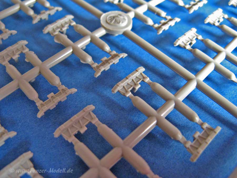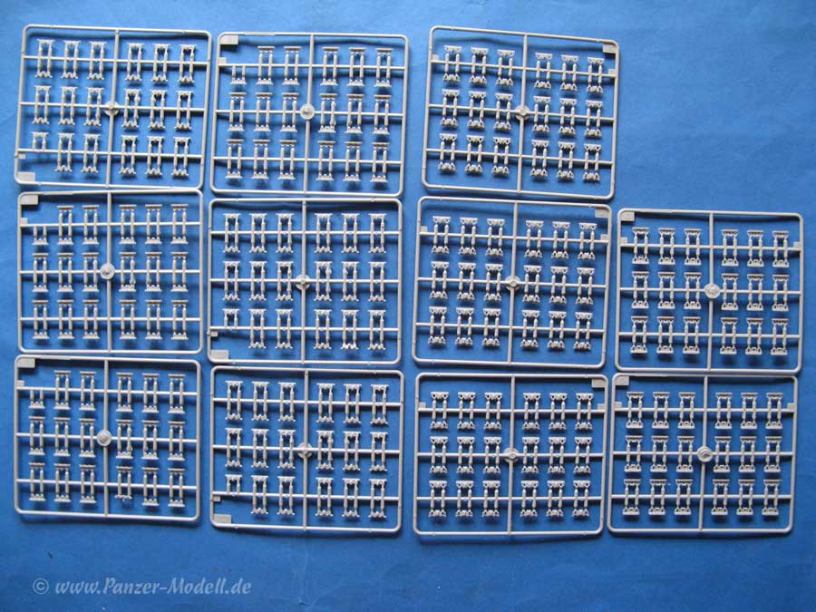 Im Karton finden sich 517 Teile an 16 Spritzlingen, der Unterwanne, zwei Sätzen Gummiketten, einer Platine mit PE Teilen und einen Decalbogen.