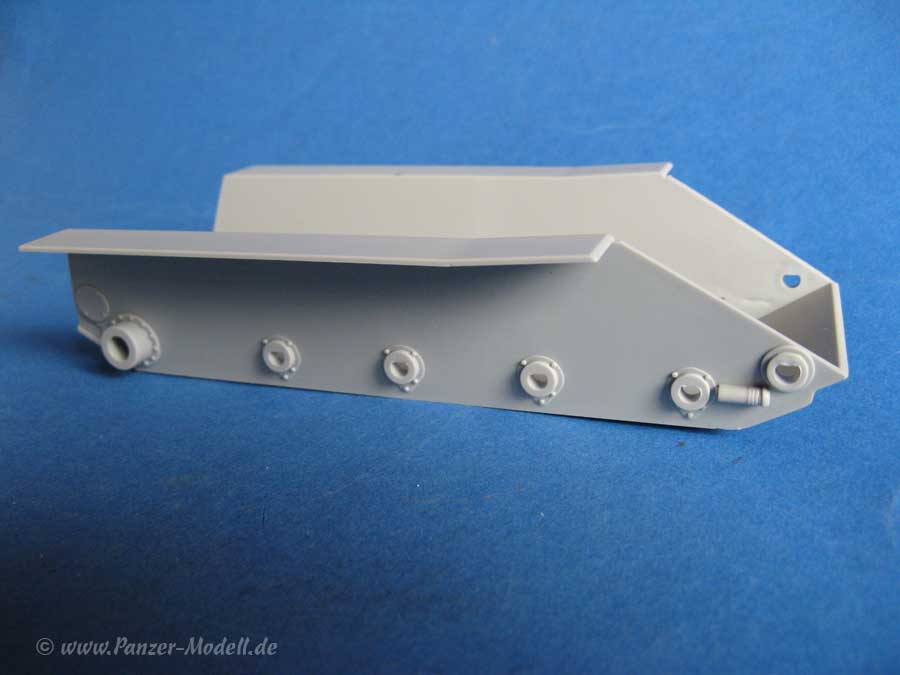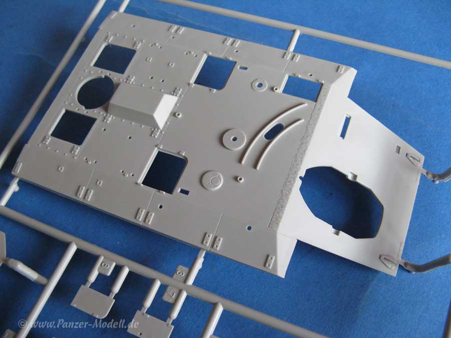 Die Oberwanne ist detailiert und relativ komplett, wobei Handgriffe, Luken und Werkzeug noch ergänzt werden. Die Lüfter werden durch beiliegende Lüftergitter aus PE Teilen gut nachdetailiert.