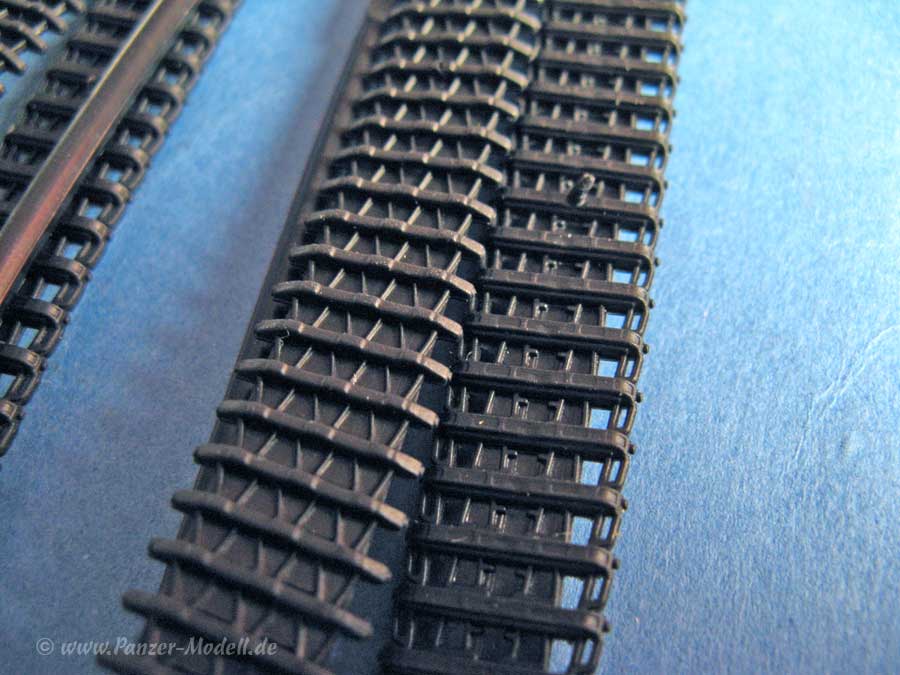 Dazu gibt es zwei verschiedene Sätze an Ketten - tituliert als frühe und späte Kette. Das schöne daran ist, dass beide verschiedenen Kettsätze sowohl als montagefreundliche Vinylketten als auch als Spritzguss-Einzelgliedketten vorliegen. Die Vinylketten machen optisch einen guten Eindruck - die Einzelgliedketten sehen auch gut aus, bedürfen aber auch Nacharbeit, denn die Innenseiten zeigen deutliche Auswerfermarken.