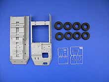 Nun hat Trumpeter nachgelegt. Und zwar gewaltig. Der Bausatz des M1127 Aufklärungsfahrzeugs besteht aus 15 Spritzgussrahmen, dem Wannenober- und Unterteil, zwei Platinen mit Fotoätzteilen, acht Vinylreifen, drei bedruckten Papierbögen mit Getränkekartons und Combat Rations, selbstklebenden Papierstreifen für die Darstellung von Zurrgurten, einem Blatt mit selbstklebenden Maskierungen für die Lackierung der Klarsichtteile vom Wind- und Wetterschutz des Fahrers und einem umfangreichen Decalbogen der die Markierung von mehren Fahrzeugen zulässt. Einer der Gussrahmen beinhaltet sogar vier Figuren mit denen die zu öffnenden Luken des Stryker besetzt werden können. Der Umfang des Bausatzes ist damit schon deutlich gegenüber dem ersten Stryker gestiegen. Viele Detailverbesserungen sind ebenfalls eingeflossen, denn über 140 der Bauteile sind neu.