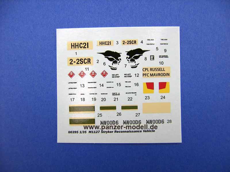 Der Decalbogen verdient ein großes Lob. Die Bumpercodes sind jetzt als komplette Decals vorhanden, während man bei dem ersten Stryker die Beschriftung noch aus einzelnen Buchstaben und Ziffern zusammensetzen musste. Das erleichtert die Markierung und Montage ganz erheblich. Es kann ein Fahrzeug des 2nd SCR dargestellt werden. Dazu liegen auch die typischen "Cougar- Köpfe" bei. Als weitere Variante wäre auch ein Fahrzeug mit abgeklebten Bumpercodes möglich, so muss man sich nicht auf eine bestimmte Einheit festlegen muss. Auch die Warnaufkleber für die Kraftstoffkanister sind vorhanden. Klasse gemacht!