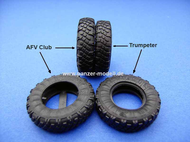 Die beiliegenden Vinylreifen sind neu. Sie weisen jetzt die seitliche Beschriftung an den Reifen auf und haben auch die wulstigen Ausbuchtungen die am Stryker M1126 noch nicht vorhanden waren. Aber leider sind die Reifen immer noch zu schmal, und vor allem im Durchmesser zu klein. Auch die Profilstollen, besonders die seitlichen zur Reifenflanke sind nicht so wirklich gelungen. Das wird auf dem Detailfoto besonders deutlich. Dort habe ich einen direkten Vergleich mit den Reifen von AFV Club und Trumpeter dargestellt. Schade, die Reifen von AFV Club geben, zumindest für mich, am Modell einen absolut stimmigen und realistischen Eindruck ab, während die Trumpeter Ausführung völlig daneben liegt.