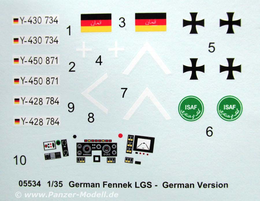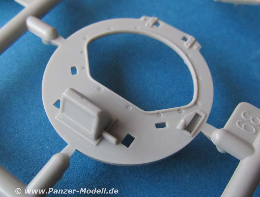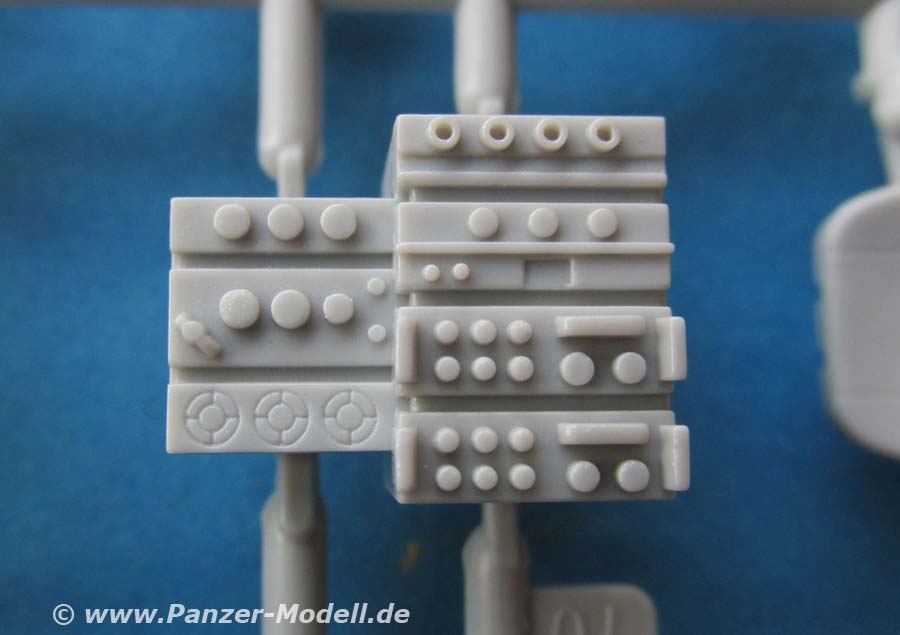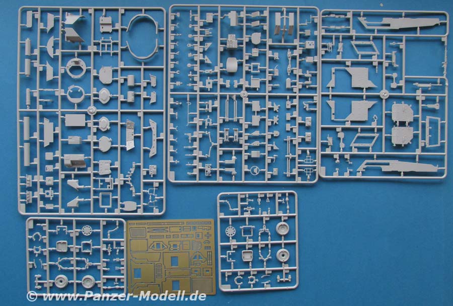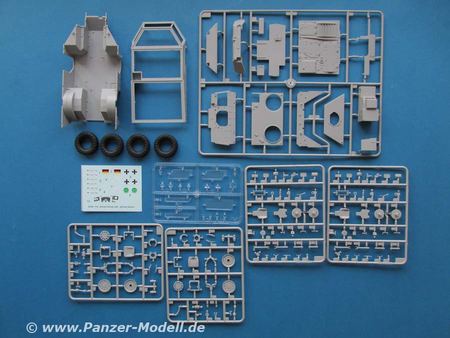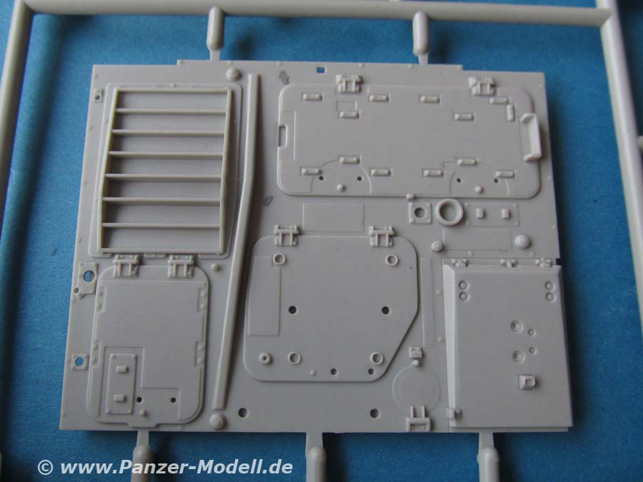 - 1x Spritzling E: Funkgerät, externe und interne Anbauteile - 1x Spritzling G: Deutsche Teile:Zusatzpanzerungsplatten seitlich, Fenstereinfassungen, seitl.Türen