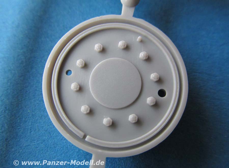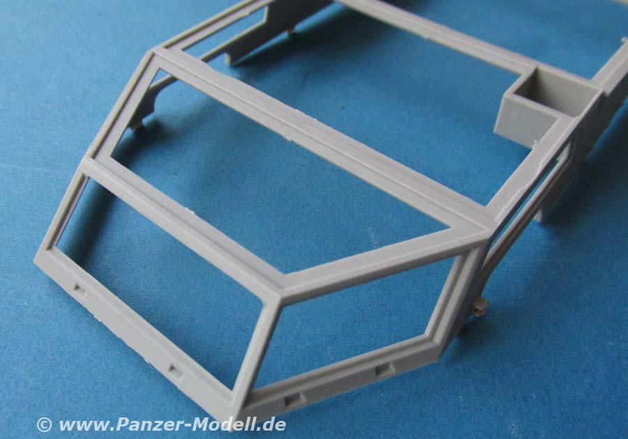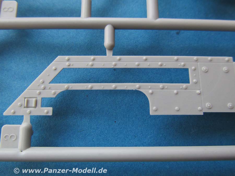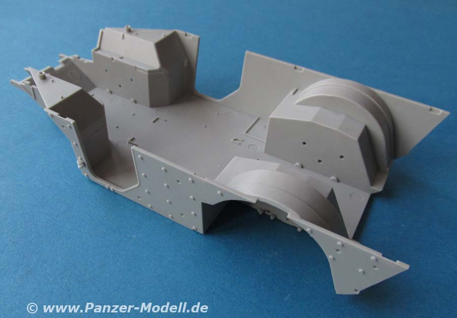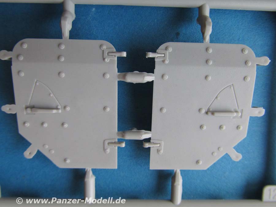 Auf die Wanne werden die spezifischen Panzerplatten seitlich aufgebracht. Diese zeigen die korrekte Art und Anordnung der Nietenköpfe der deutschen Version. Dies gilt auch für die seitlichen Türen. Unverständlicherweise ist hier an der Aussenseite der lange Türgriff fest angegossen und massiv, während diese auf der Innenseite schön einzeln eingeklebt werden können.