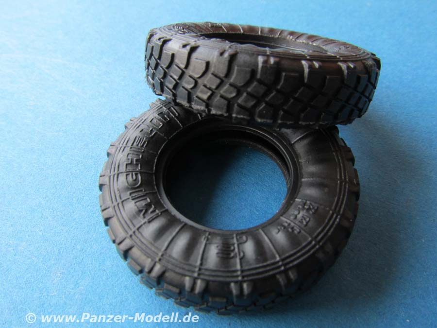 Das Fahrwerk wird pro Radstation mit Federung, Aufhängung und Antriebswellen dargestellt. Es scheint nicht vorgesehen zu sein, aber aufgrund der Bauteile offenbar selber machbar, dass die Vorderräder eingeschlagen baubar sind. Die Vinylreifen werden auf die Plastikfelgen, die sich aus 3 Teilen plus Polycap zusammensetzen, gesetzt. Der Detailgrad hier ist wirklich schön und gerade die Vinylreifen wissen mit dem guten Profil und feinem Herstelleraufdruck an den Seiten zu gefallen.