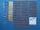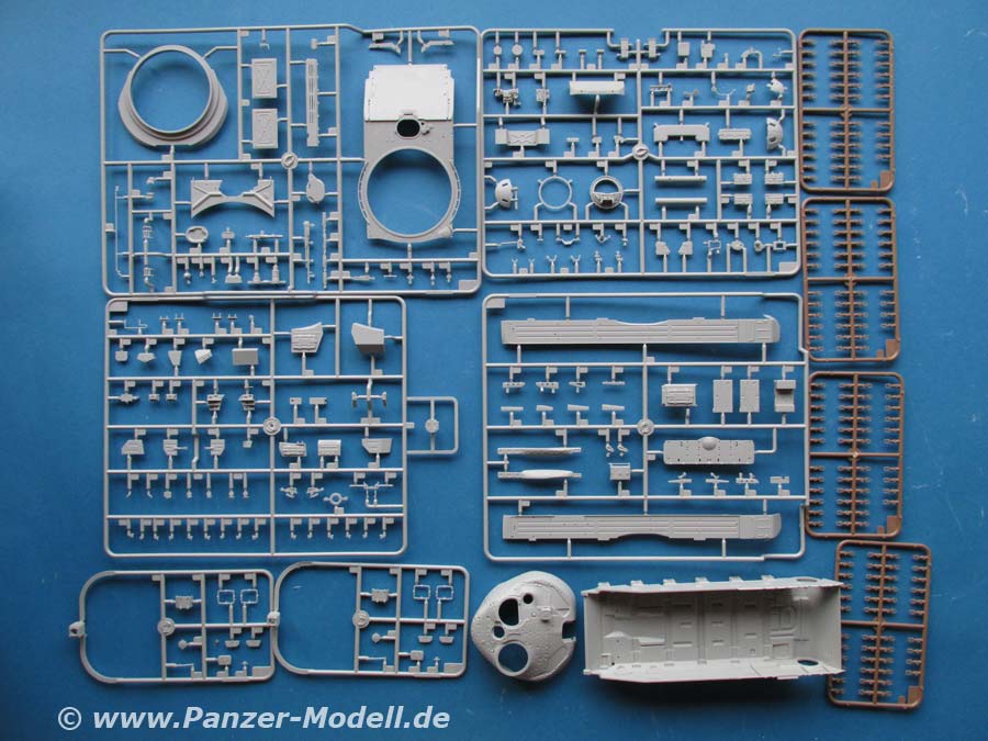 Der Bausatz enthält 16 Spritzrahmen aus hellgrauem Plastik, einen Spritzling Klarsichteile für Optiken und Beleuchtung, drei Platinen mit PE-Teilen, acht Spritzrahmen zum Bau der Einzelgliederkette, ein Spritzling mit Weichkunststoff, das Wannenunterteil, das Turmoberteil, Kupferdraht, Polycaps, Vinyl-Schlauch und ein Decalbogen.