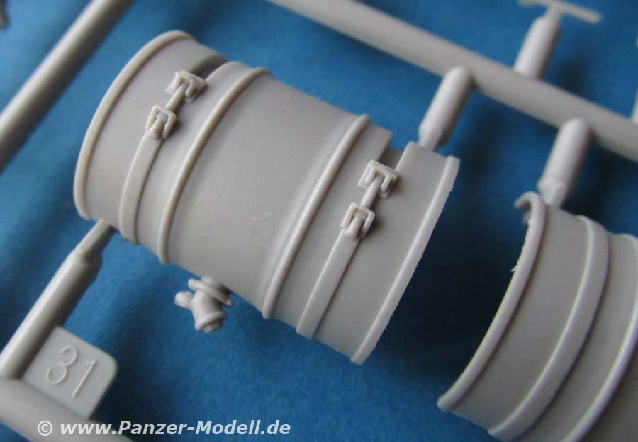 Natürlich sind auch die Fässer und Halterungen der treibstofffässer am Wannenheck enthalten und die Treibstoffleitungen mittels Vinylschläuchen anbaubar.