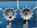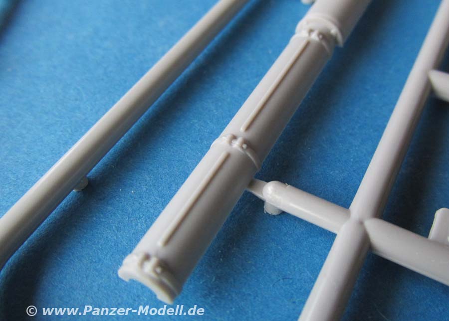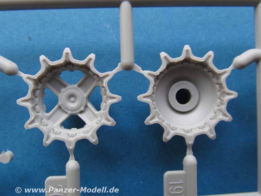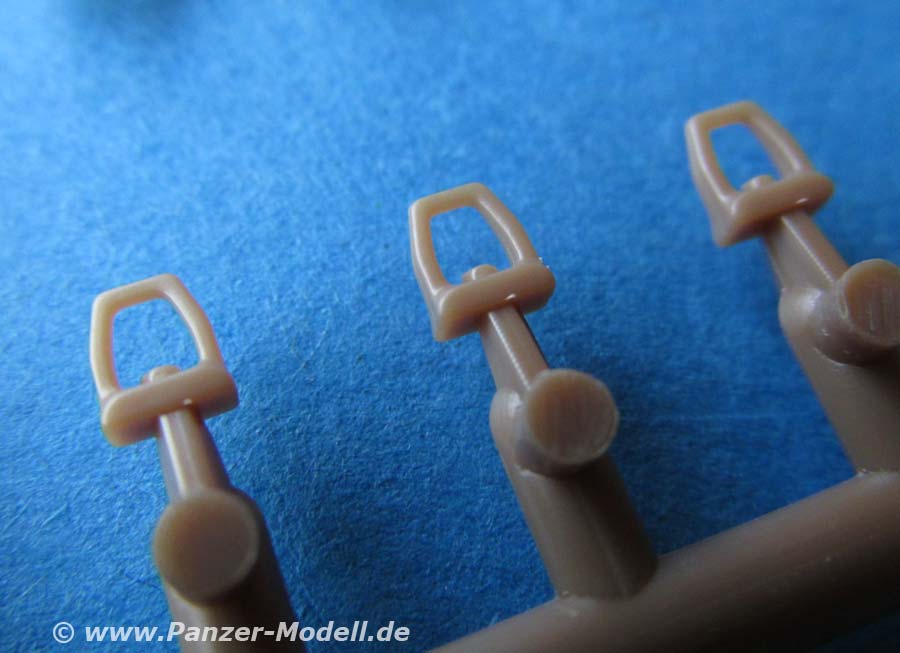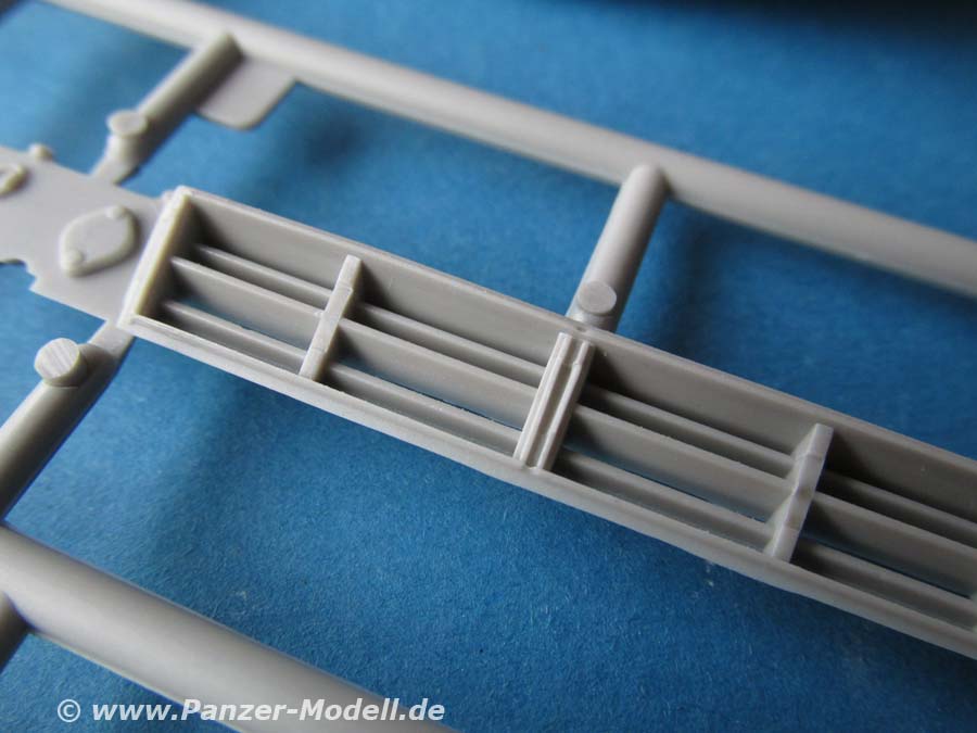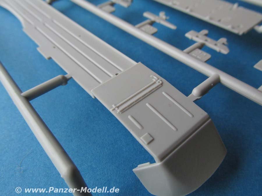 Auch an den Kettenblechen und Seitenschürzen hört die Freude nicht auf. Auch hier sauberer Guss und klare, saubere Details. Sogar die bereits angegossenen Halterungen, Staukisten, Nietenköpfe und Anbauteile sind ganz ausgezeichnet dargestellt. Dünne halterungen werden zusätzlich als Ätzteile angeboten und müssen vom Modellbauer aufgebracht werden. Bei den Seitenschürzen wurde sogar an eine leicht wellige Form gedacht um die im original aus Gummi gemachten Schürzenteile realistisch darzustellen.
