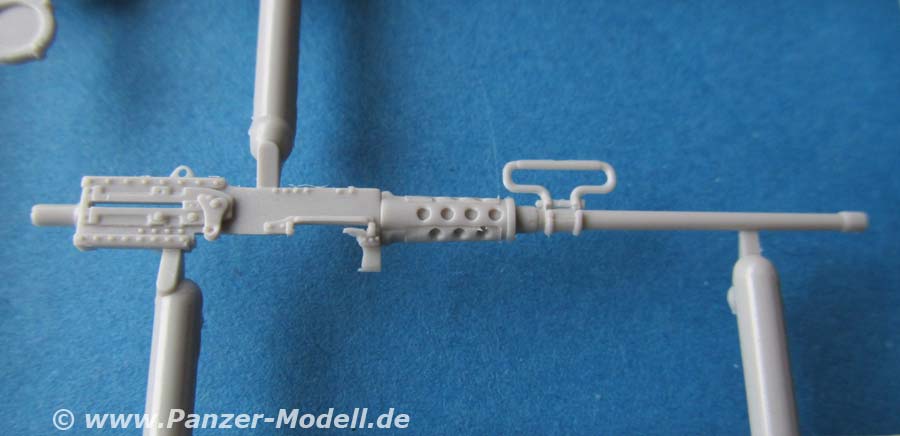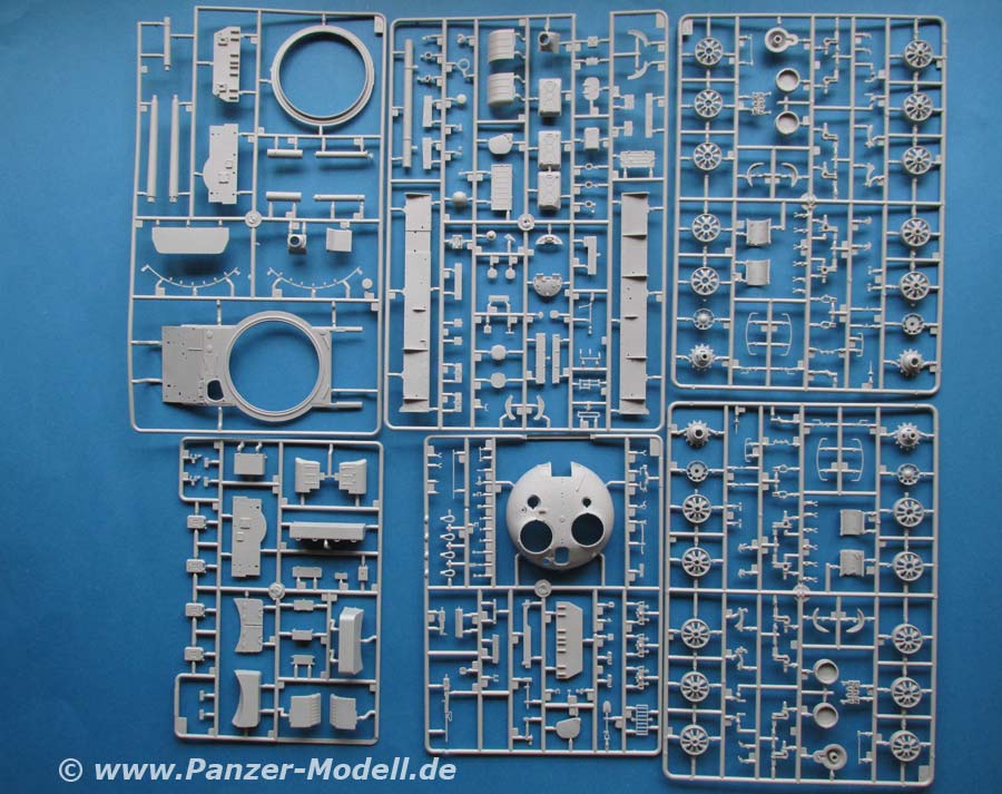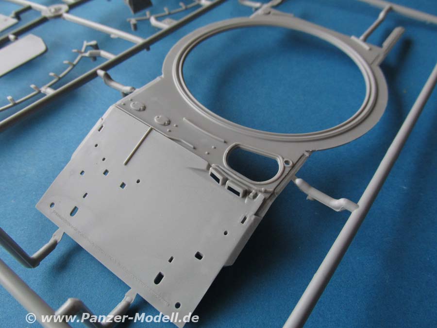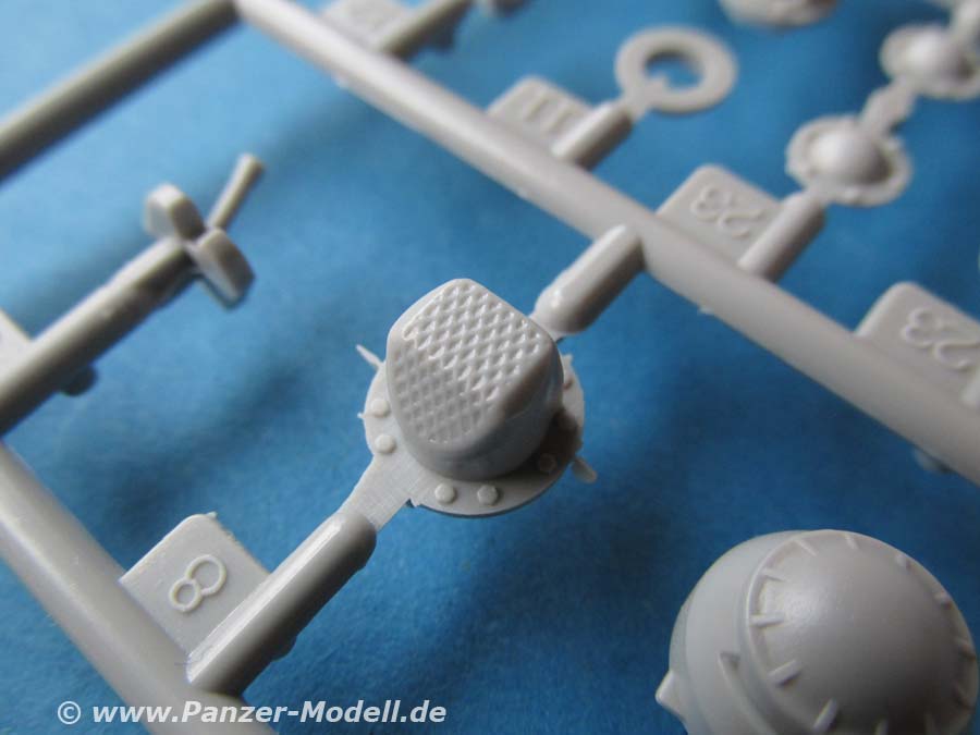 Der Turm ist sehr schön gegossen - raue und realistische Gussstruktur und feine Details. Die Luken lassen sich offen oder geschlossen darstellen. Das .50er Browning das auf dem vorderen Turmdachinstalliert wird, ist aus Plastik und in wirklich bestechend feiner Detailllierung. Die neuen Staukisten am Turmheck sind ebenfalls sehr gefällig und detailliert. Auch die übrigen details am Turm wie Zielscheinwerfer, Antennensockel, Entfernungsmesser, kanisterhalterungen, usw.. können sich wirklich sehen lassen.
