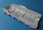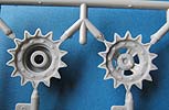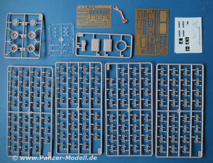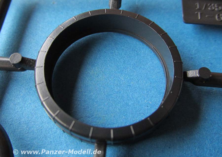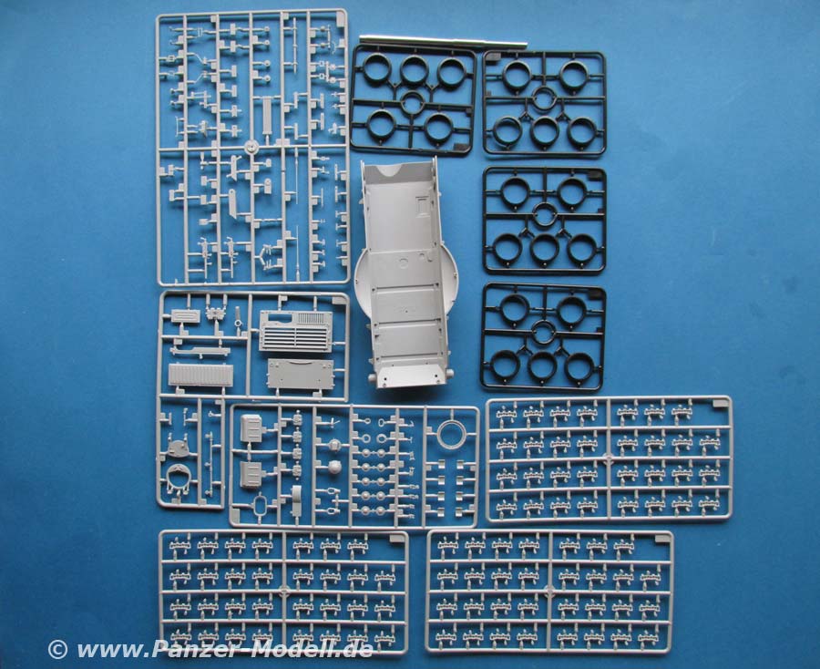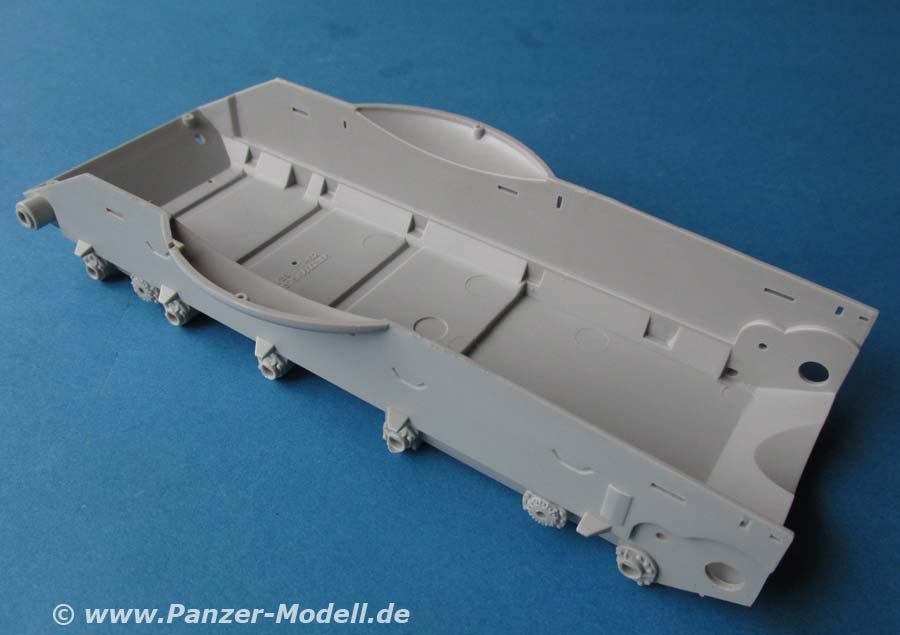 Die Unterwanne ist in einem Stück gemacht und mit seinem verwinkelten Unterboden schön dargestellt. Die Schwingarme werden einzeln eingesteckt und verklebt. Damit ist das Laufwerk zwar nicht beweglich, aber ohne große Probleme nach Wunsch positionierbar. Die Laufrollen wie auch Leit- und Treibräder machen einen exzellenten Eindruck mit tollen Formen und Details. Der Clou sind hierbei aber die separat beiliegenden Gummibandagen aus schwarzem Plastik.
