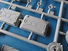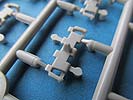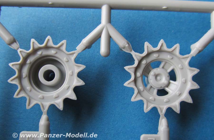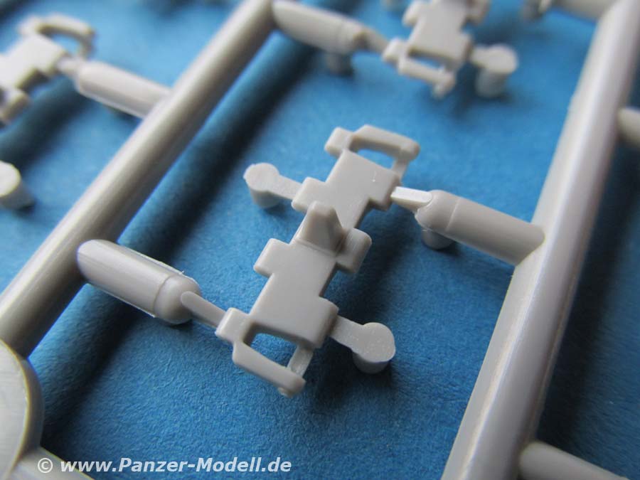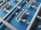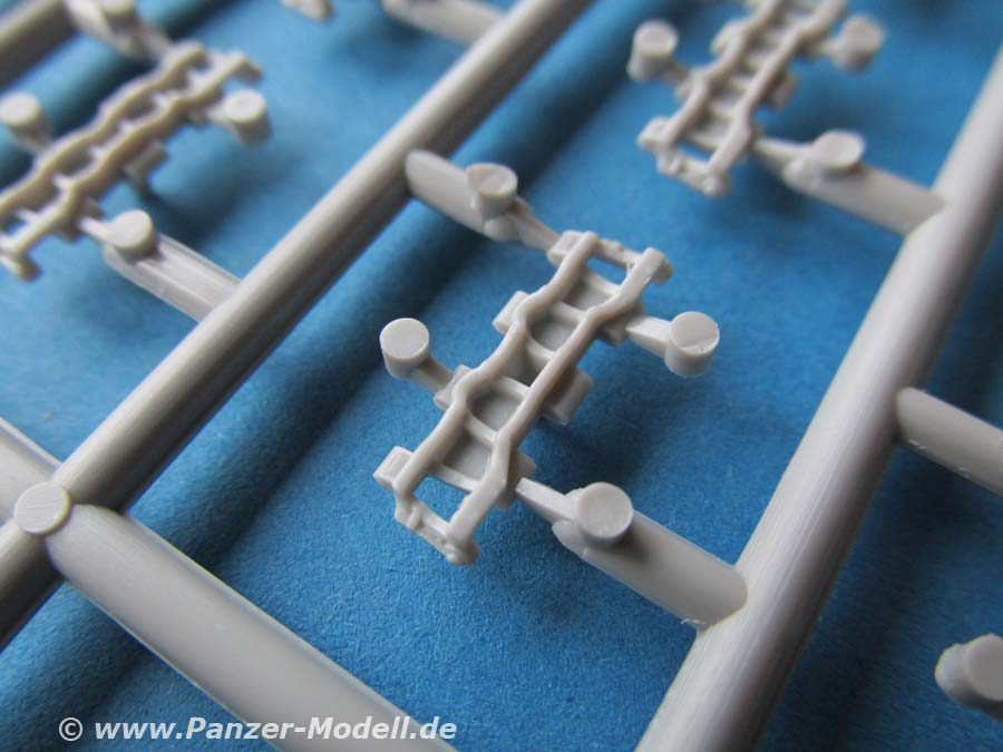 Die Ketten liegen als Einzelgliedketten bei, die allerdings noch aus dem Spritzling getrennt werden müssen. Dabei sitzt jedes Glied an vier Angüssen. Die Qualität und Details der Glieder ist sehr gut und fein und vor allem ohne störende Auswerferstellen!