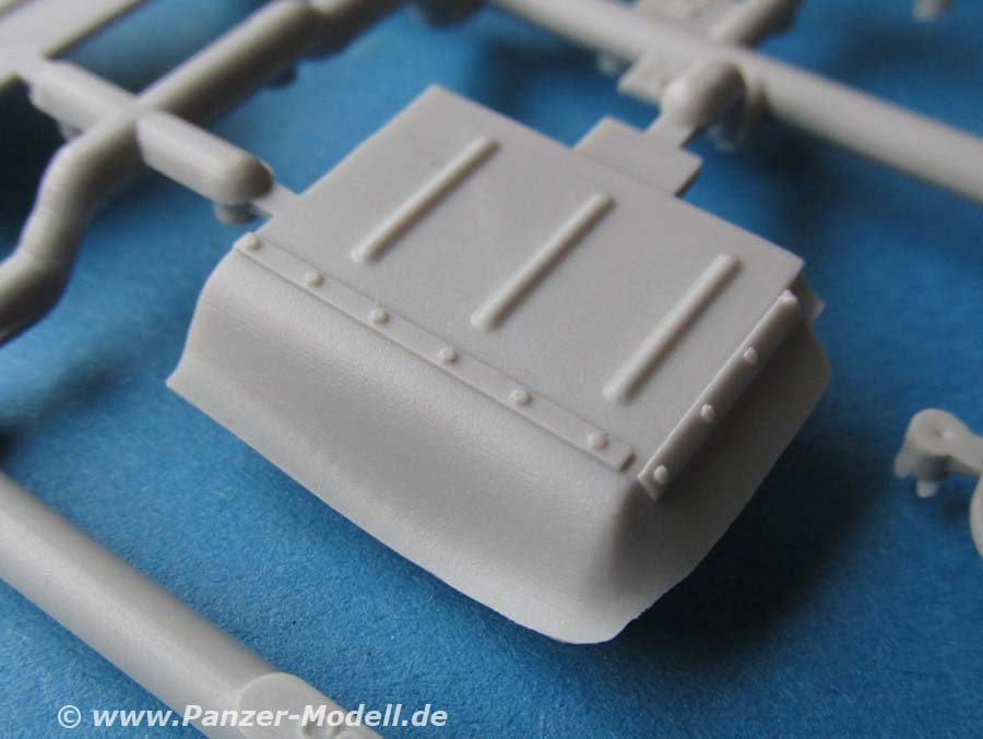 Die Oberwanne ist vielmehr nur ein Deckblech für den vorderen Teil mit Turmring. Das Motordeck setzt aus zwei teilen mit durchbrochenen Rippen und PE Gittern. Es gibt zwar keinen Motorraum im Inneren aber das Motordeck ist auch so ein absoluter Hinkucker. Dazu gibt es die einzeln anzubringenden Kettenbleche und Zusatztanks und Staukisten.