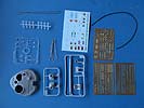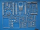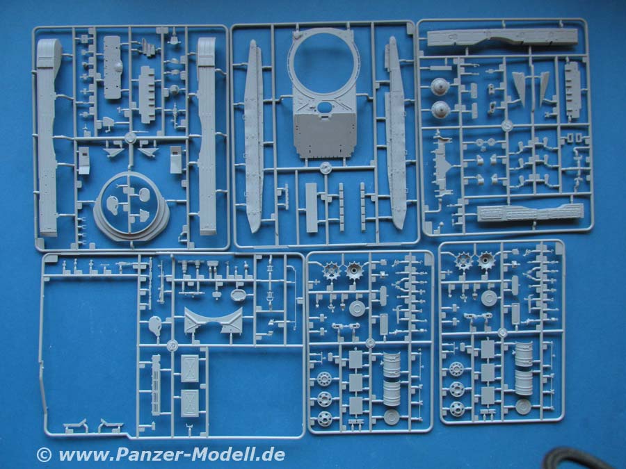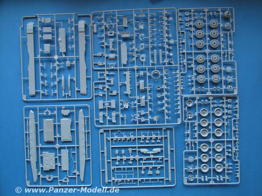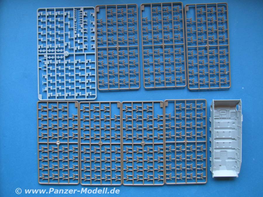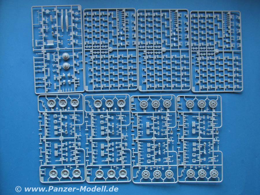 Der erstaunlich große Bausatzkarton ist randvoll gefüllt mit 28 Spritzlingen, zwei Spritzlinge in Vinyl Plastik, ein Spritzling in klarem Plastik, Unterwanne, Turmoberteil, drei PE Platinen, Polycaps, Draht- und Seilmaterial und ein Decalbogen.